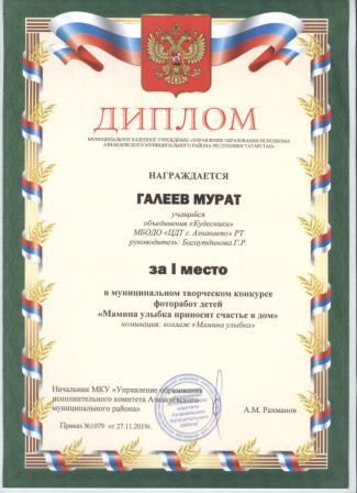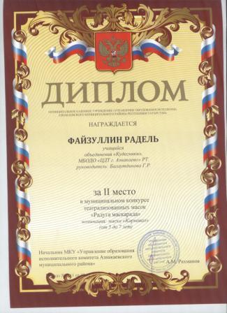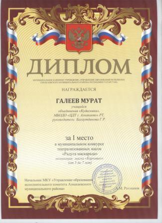 1 место в муниципальном конкурсе театральных масок «Радуга маскарада» (Галиев М., Багаутдинова Г.Р.)