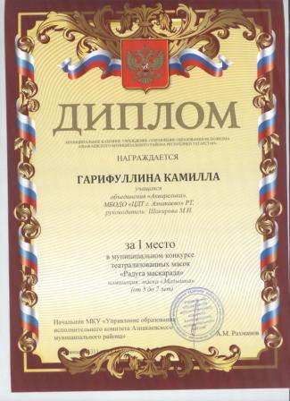 1 место в муниципальном конкурсе театральных масок «Радуга маскарада» (Гарфуллина К., Шакирова М.И.)