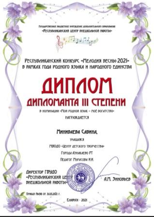 3 место в Республиканском конкурсе "Мелодия весны" (Минибаева С.)