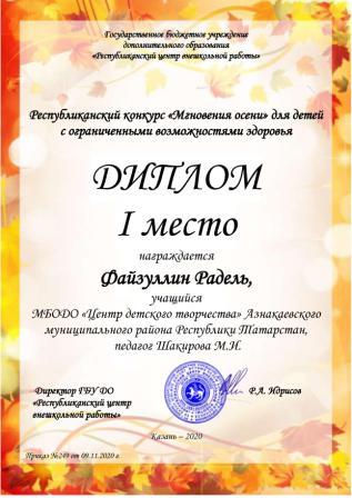 1 место в Республиканском конкурсе "Мгновения осени" для детей с ОВЗ (Фазуллин Р., Шакирова М.И.)