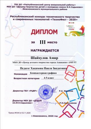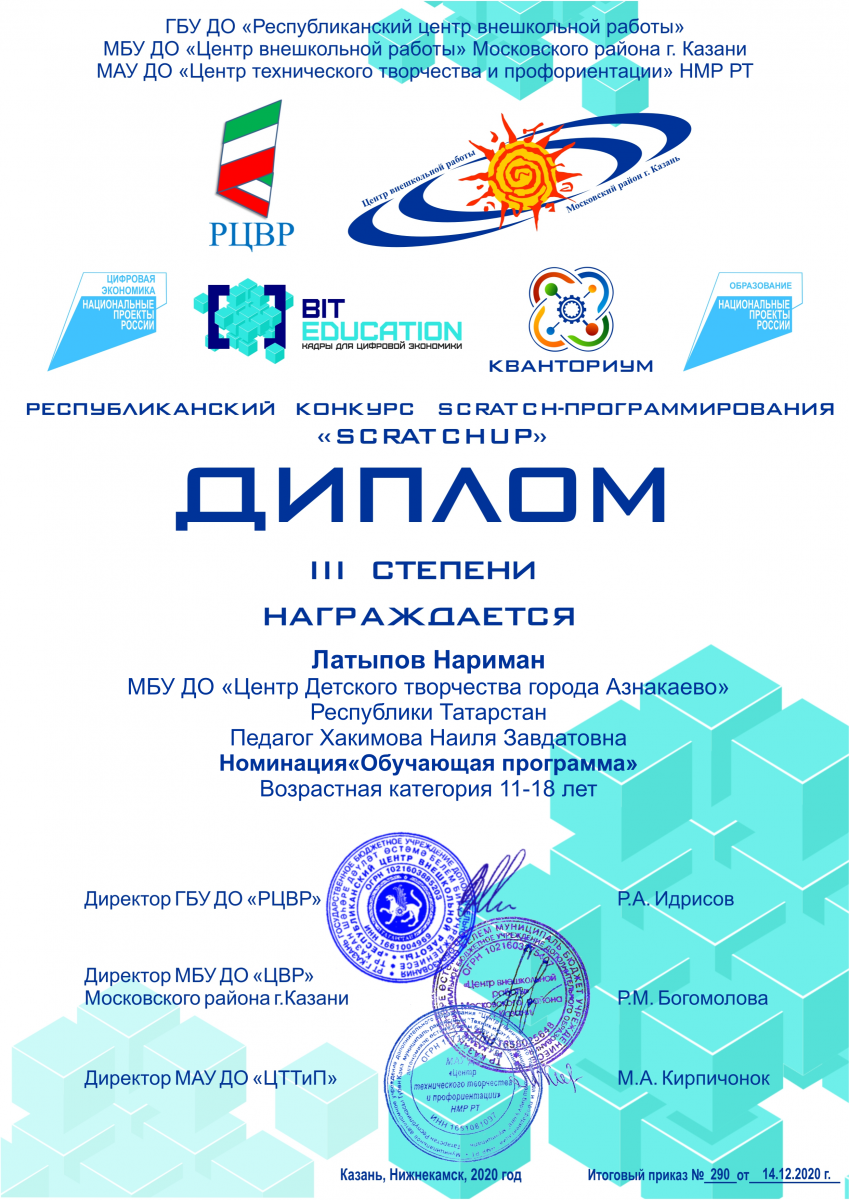 3 место в Республиканском конкурсе Scratch-программирование” (Латыпов Н., Хакимова Н.Д.)
