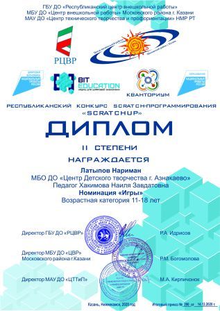 2 место в Республиканском конкурсе Scratch-программирование” (Латыпов Н., Хакимова Н.Д.)
