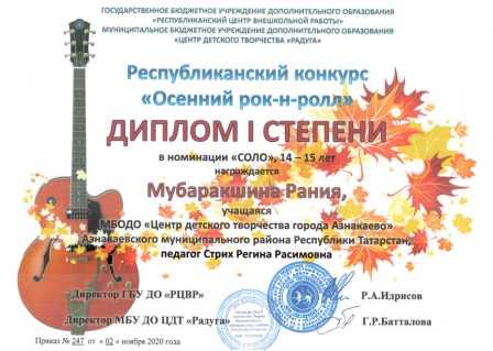 1 место в Республиканском конкурсе «Осенний рок-н-ролл» (Мубаракшина Р., Стрих Р.Р.)