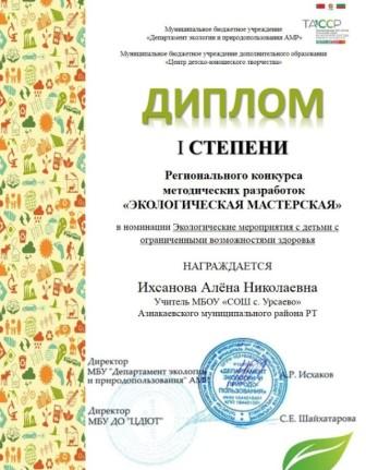 1 место в Региональном конкурсе методических разработок "Экологическая мастерская" (Ихсанова Э.Т.)