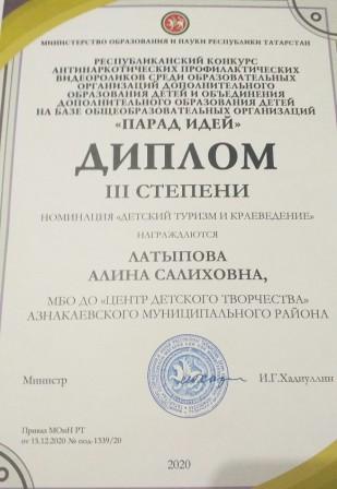 3 место в Республиканском конкурсе антинаркотических профилактических вдеороликов (Латыпова А.С.)