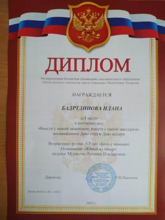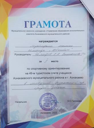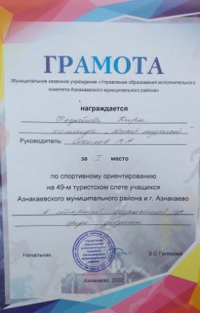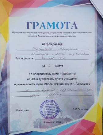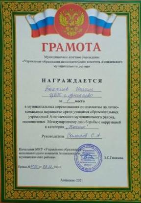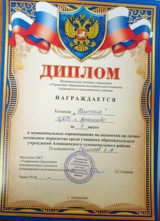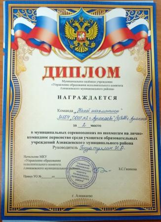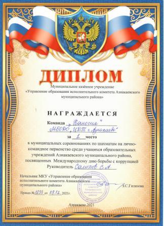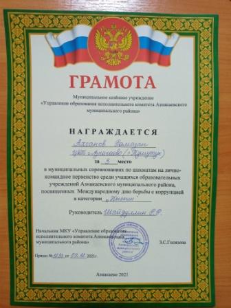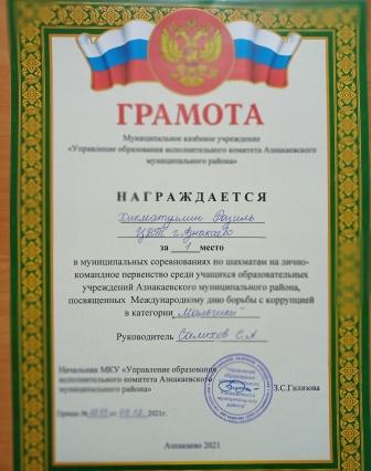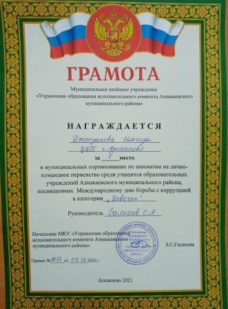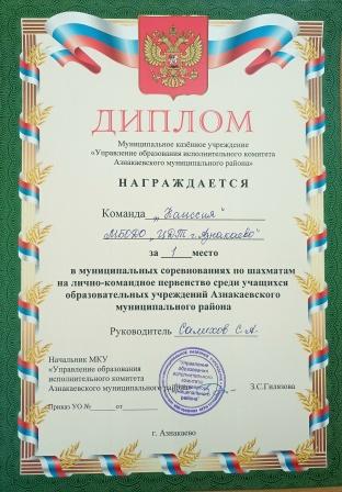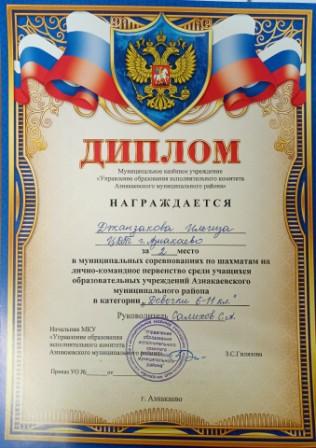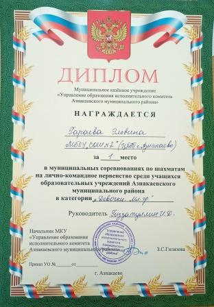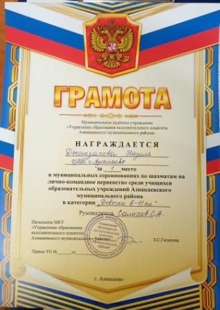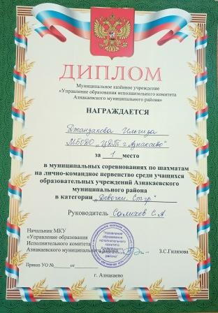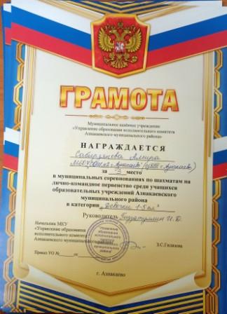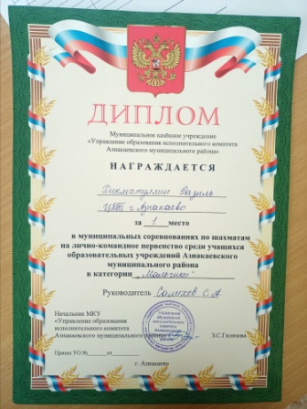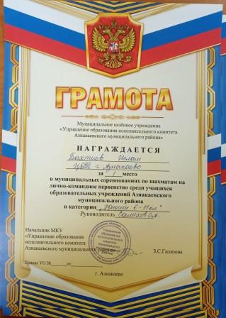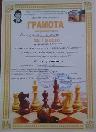 1 место в муниципальном турнире по шахматам им. Ф.М. Латыпова (Джанзакова И., Салихов С.А.)