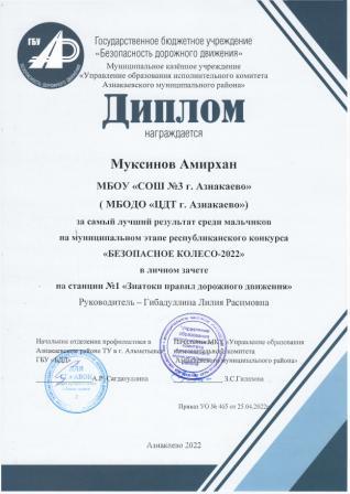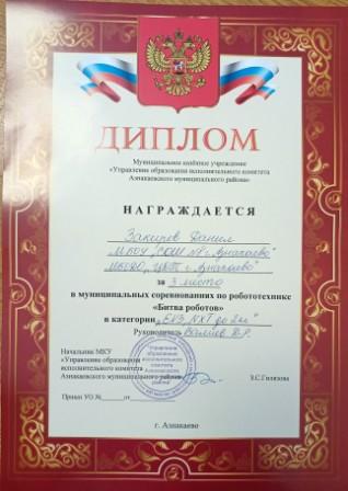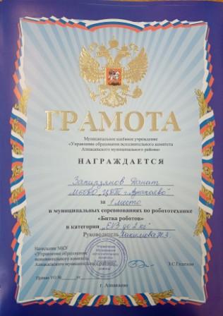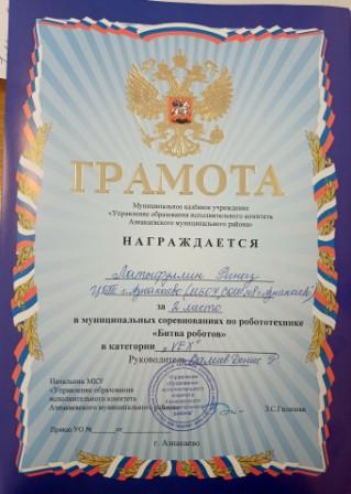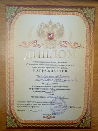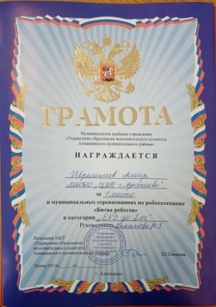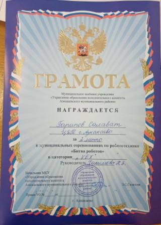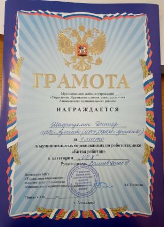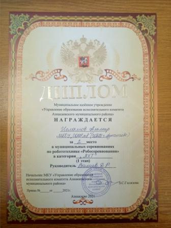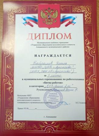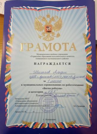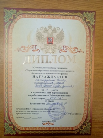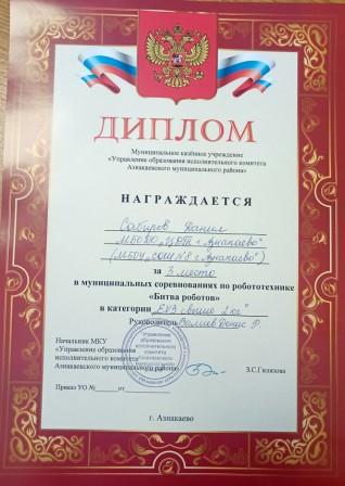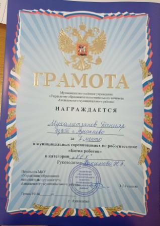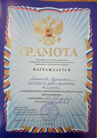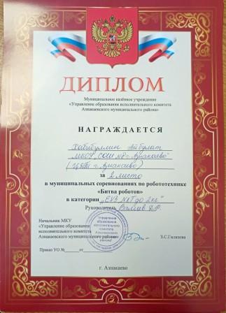 2 место в муниципальных соревнованиях по робототехнике "Робосоревнования" (Исламов А., Валиев Д.Р.)
