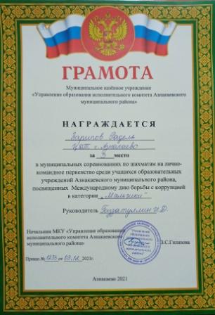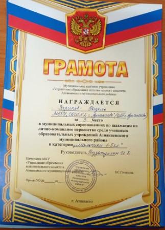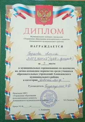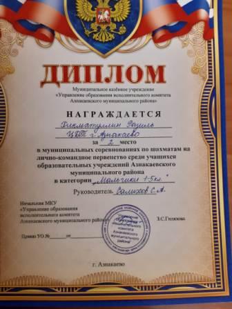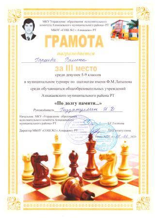 3 место в муниципальном турнире по шахматам им. Ф.М. Латыпова (Гараева Р., Гиззатуллин И.Д.)