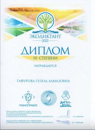 3 место во Всероссийском конкурсе "Экодиктант" (Гафурова Г.)