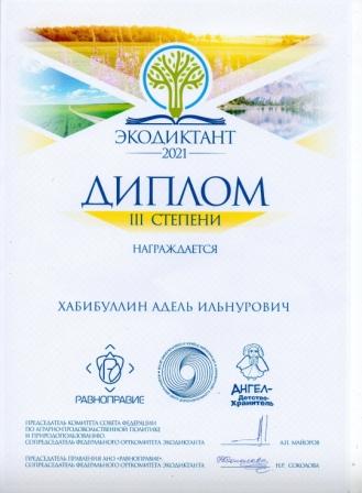 3 место во Всероссийском конкурсе "Экодиктант" (Хабибуллин А.)