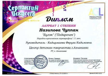 1 место в Всероссийском конкурсе-фестивале искусств "Подарочек" (Назипова Ч., Кадырмаева Ф.К.)