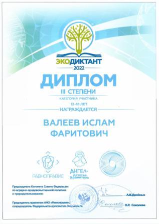 3 место во Всероссийском экологическом диктанте (Валеев И.)