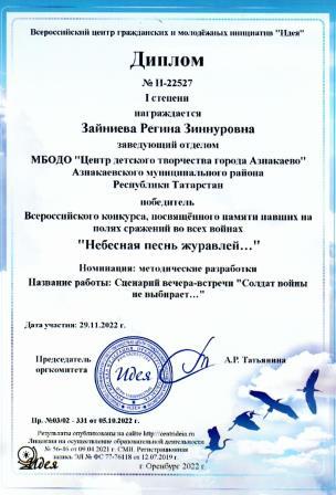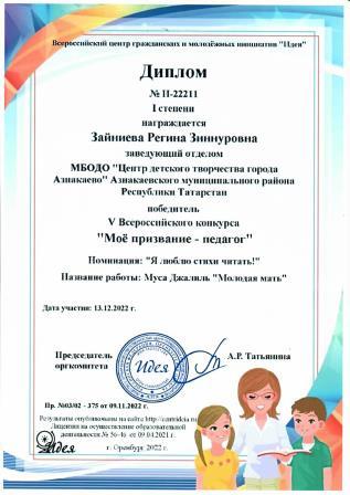 1 место во Всероссийском конкурсе "Мое призванье - педагог" (Зайниева Р.З.)