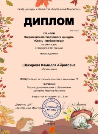 Гран-при на Всероссийском творческом конкурсе "Осень- грибная пора" (Шакирова К., Шакирова М.И.)