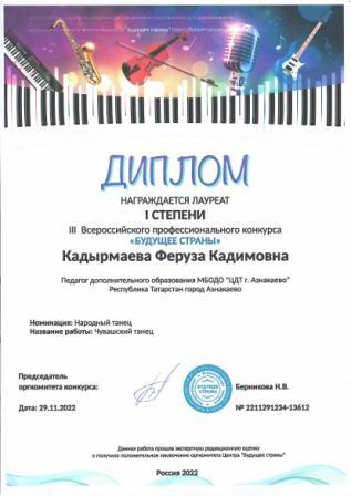 Лауреат 1 степени на Всероссийском профессиональном конкурсе "Будущее страны" (Кадырмаева Ф.К.)