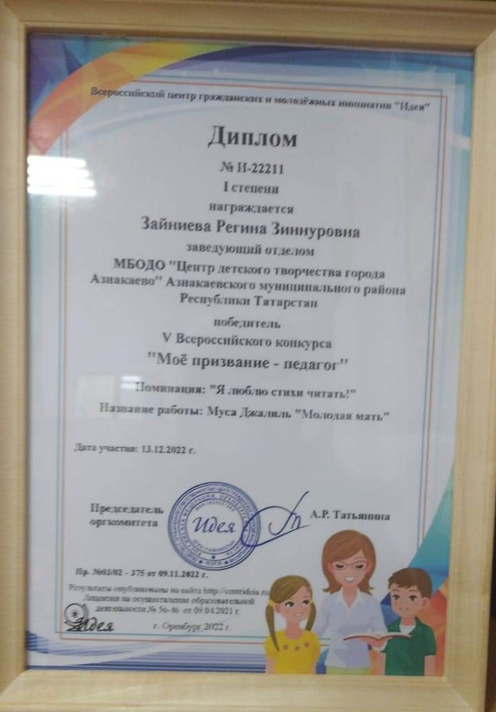 1 место во Всероссийском конкурсе "Мое призвание- педагог" (Зайниева Р.З.)
