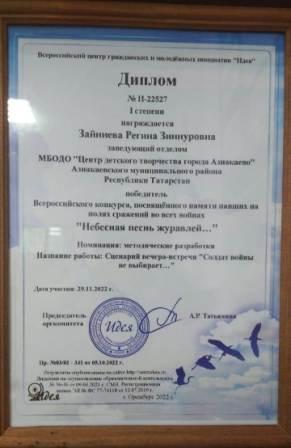 1 место во Всероссийском конкурсе в номинации "Методические разработки" (Габдрахманова Р.И.)