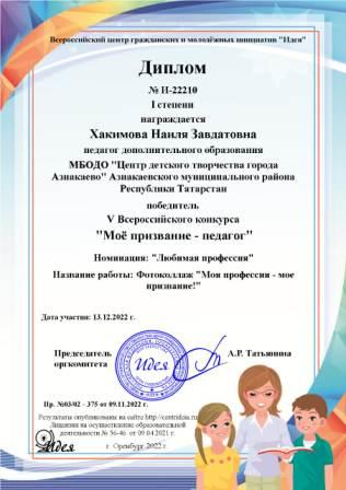 1 место во Всероссийском конкурсе "Мое призвание - педагог" (Хакимова Н.З.)