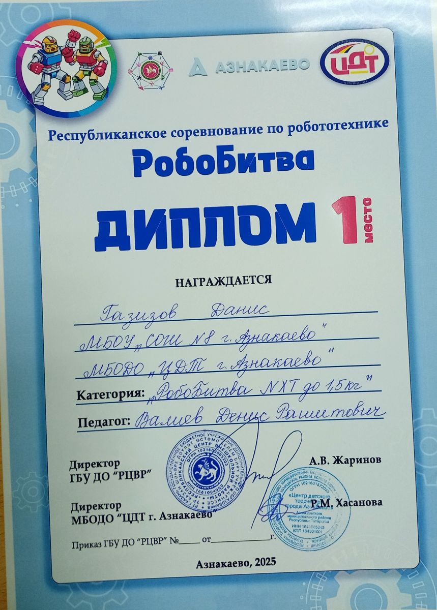 1 место в Республиканском соревновании по робототехнике "Робобитва" (Газизов Д., Валиев Д.)