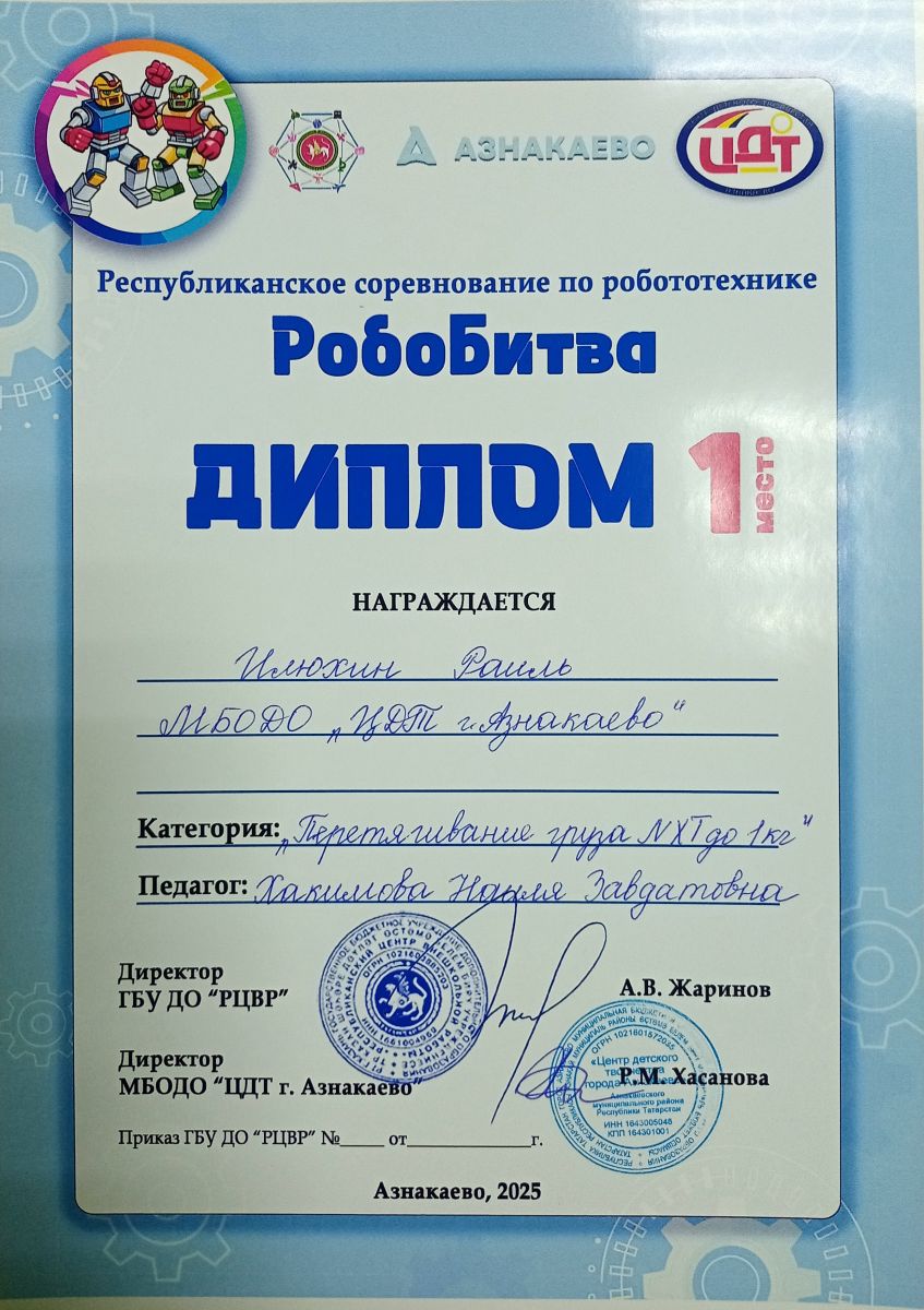1 место в Республиканском соревновании по робототехнике "Робобитва" (Шигабутдинов И., Хакимова Н.З.)