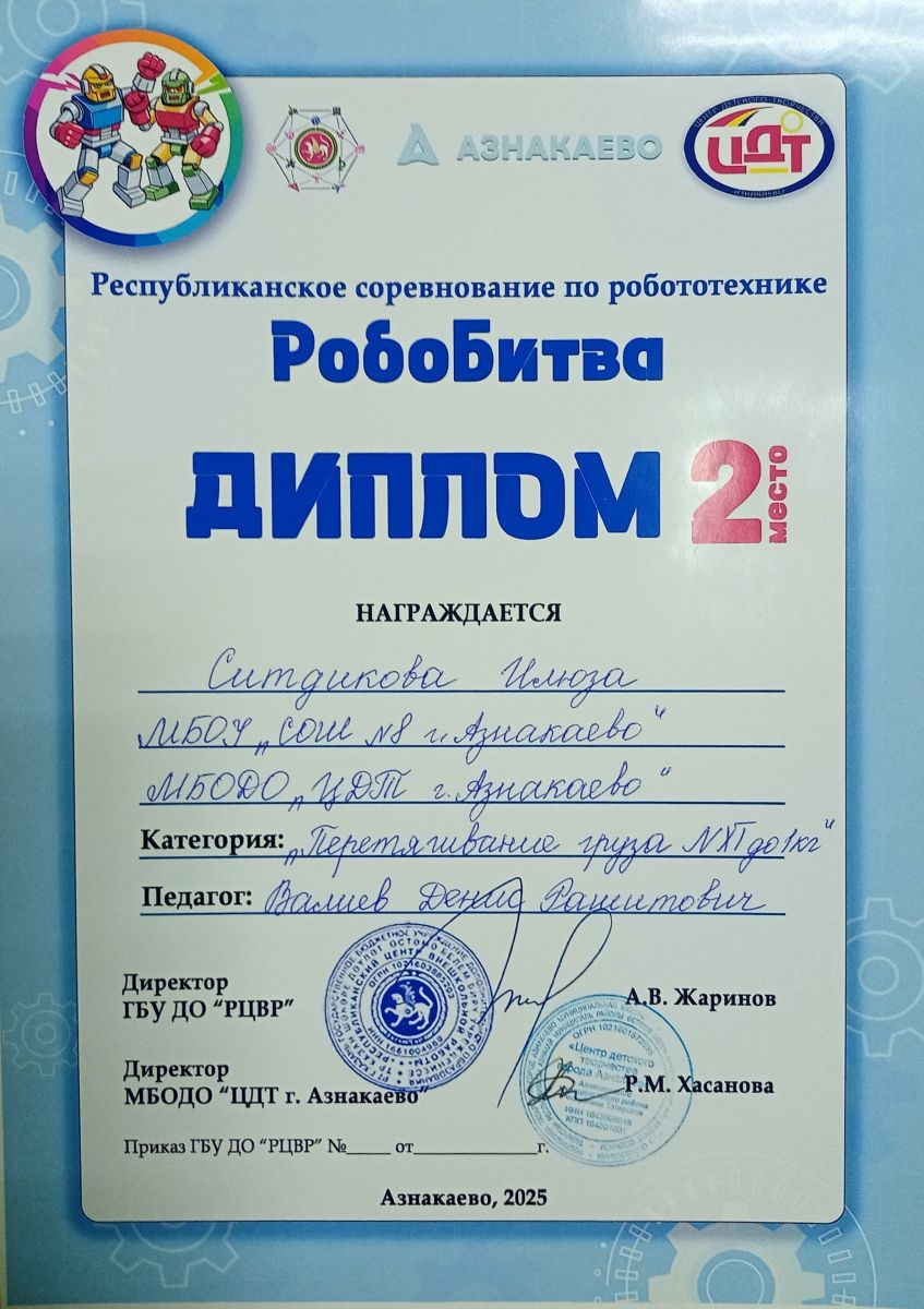 2 место в Республиканском соревновании по робототехнике "Робобитва" (Ситдиков И., Валиев Д.)