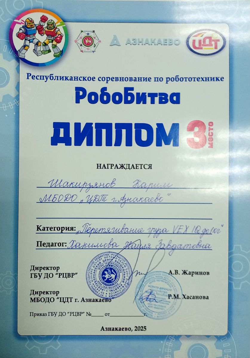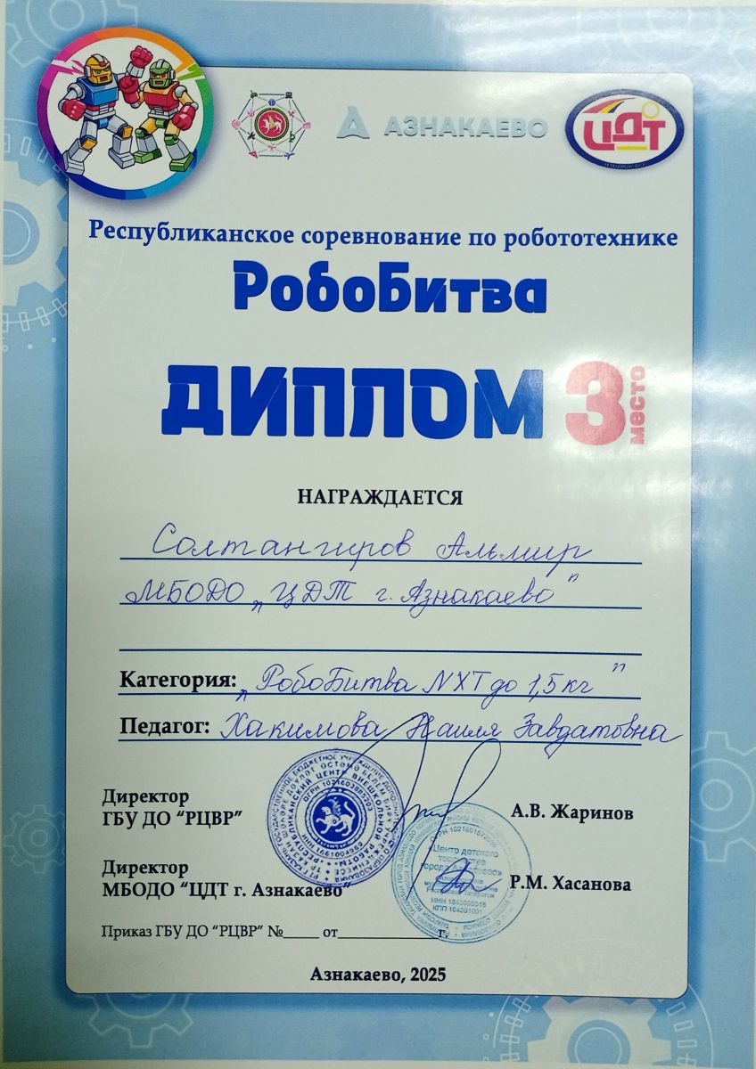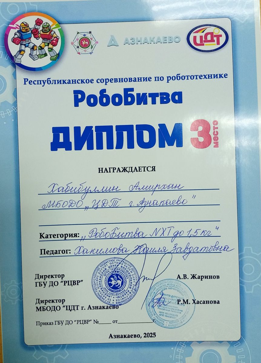 3 место в Республиканском соревновании по робототехнике "Робобитва" (Хабибуллин А., Хакимова Н.З.)