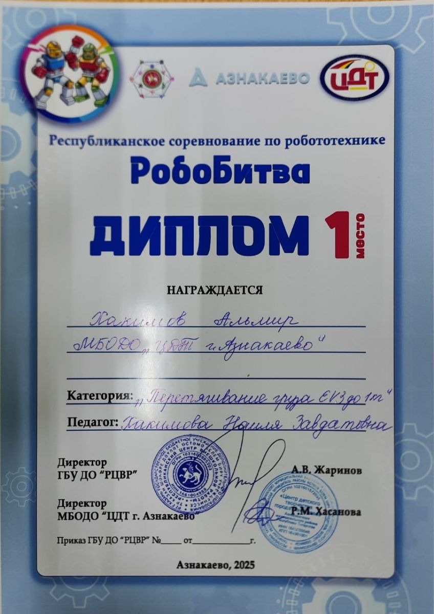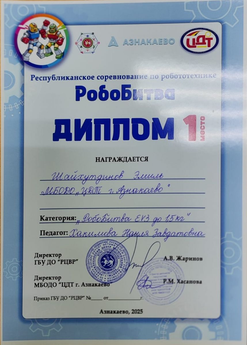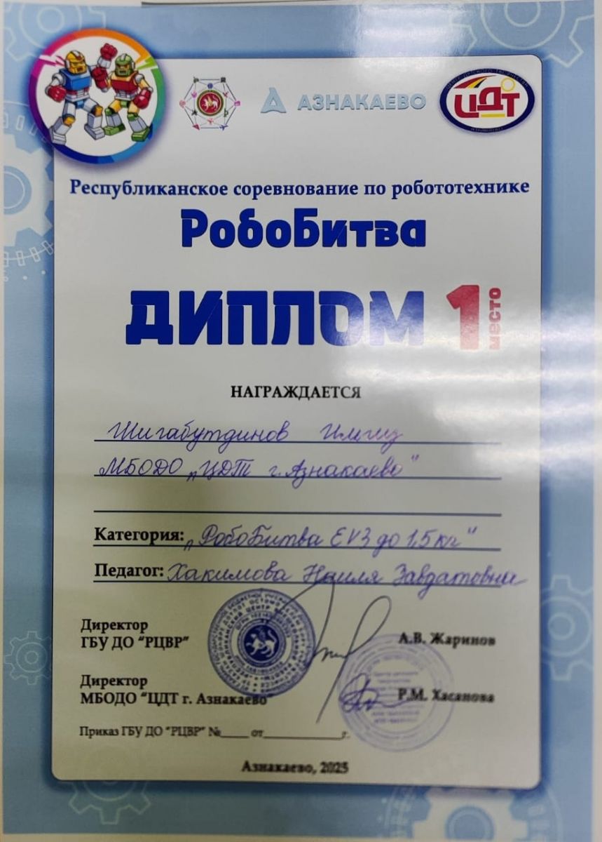 1 место в Республиканском соревновании по робототехнике "Робобитва" (Шайхутдинов Э., Хакимова Н.З.)