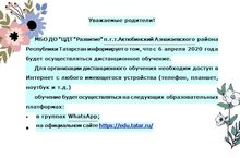 МБО ДО ЦДТ "Развитие" пгт.Актюбинский Азнакаевского района Республики Татарстан информирует о том, что с 6 апреля 2020г.будет осуществляться дистанционное обучение.