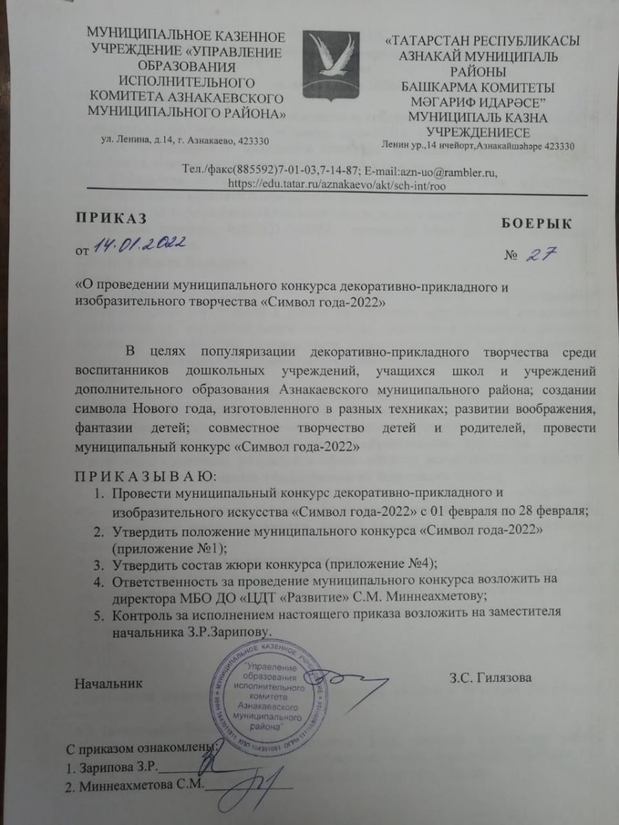 - / Приказ №27 от 14.01.2022г. "О проведении муниципального конкурса декоративно-прикладного и изобразительного творчества "Символ года - 2022"