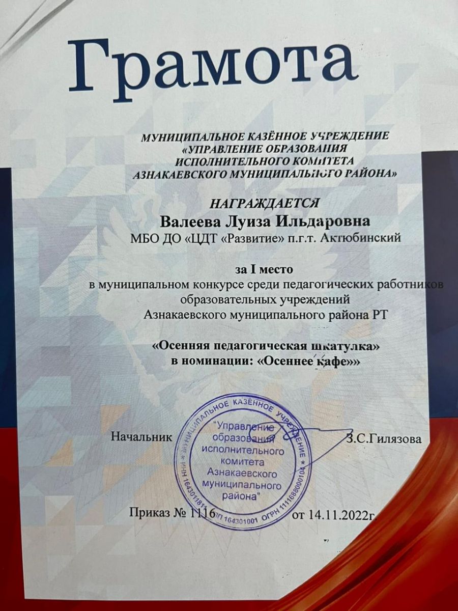 Грамота за 1 место в муниципальном конкурсе "День леса", педагог Валеева Л.И.