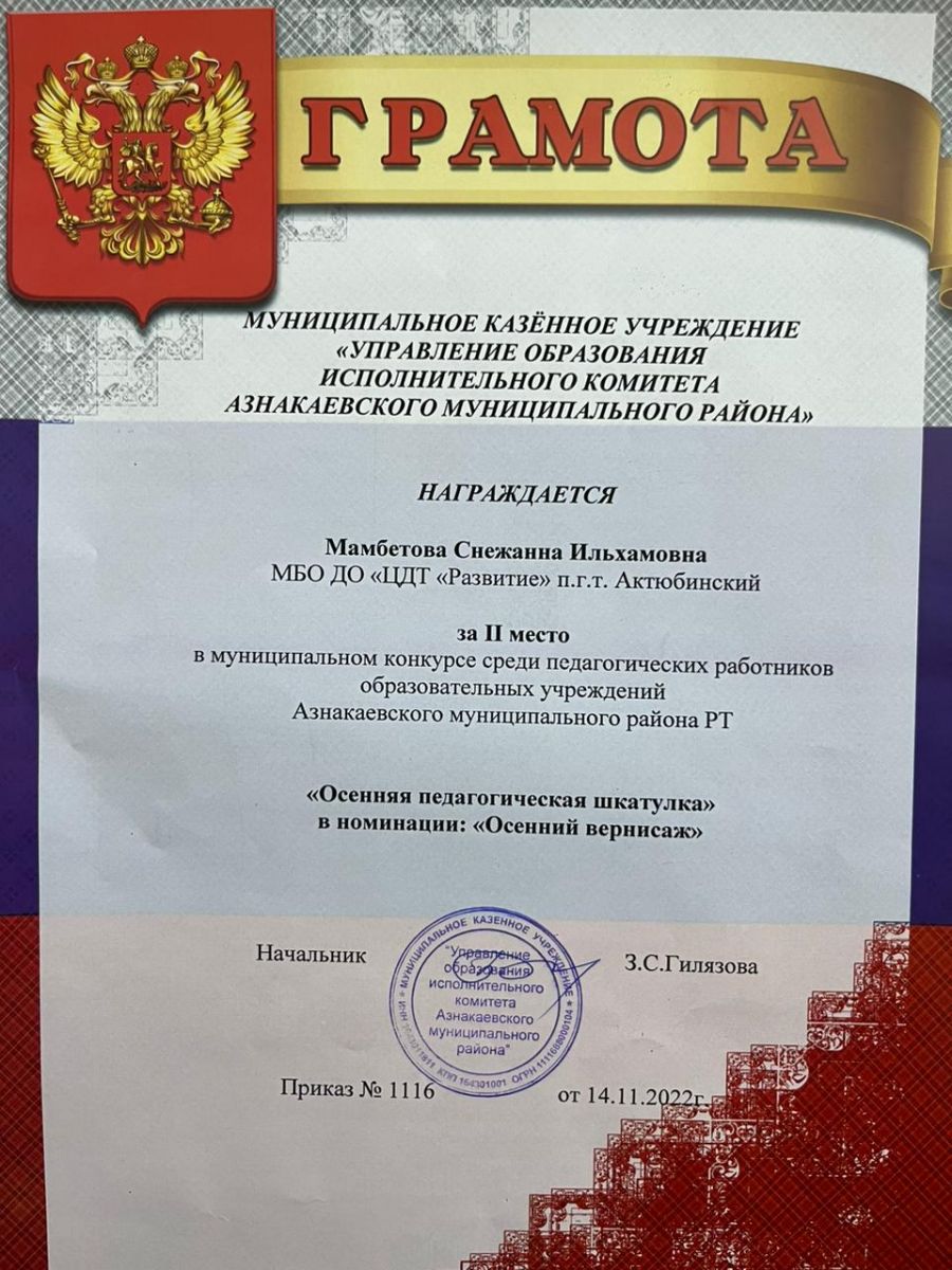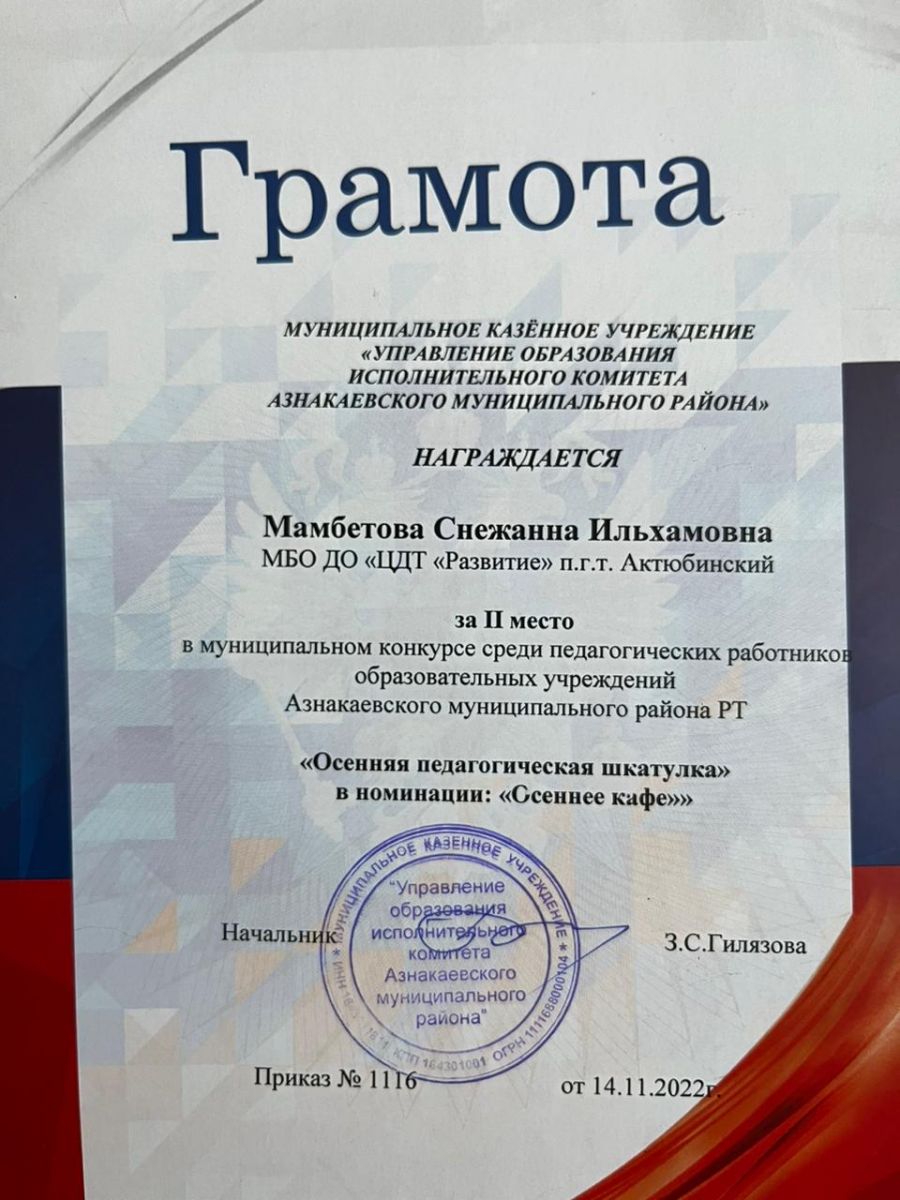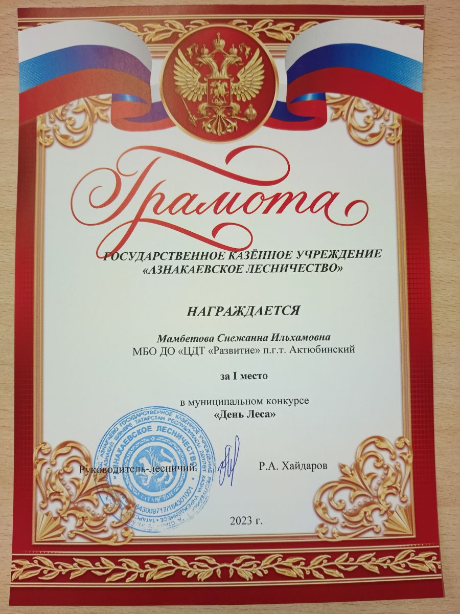 Грамота за 1 место в муниципальном конкурсе "День леса", педагог Мамбетова С.И.