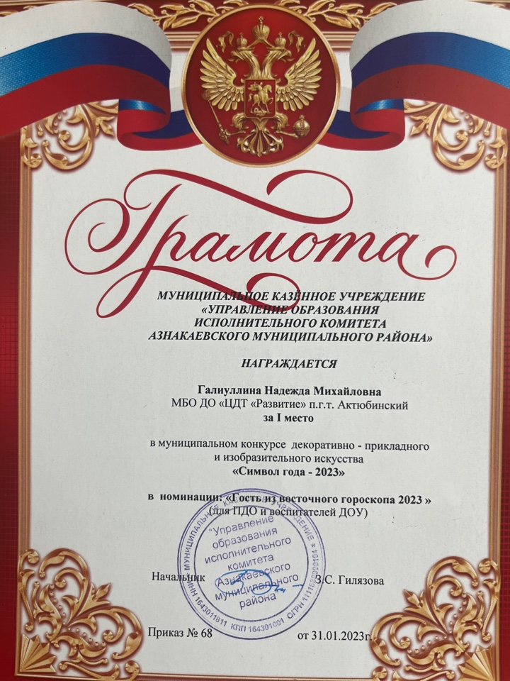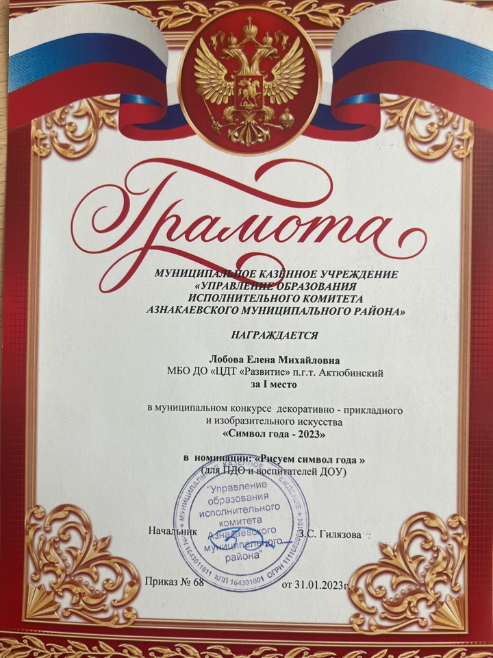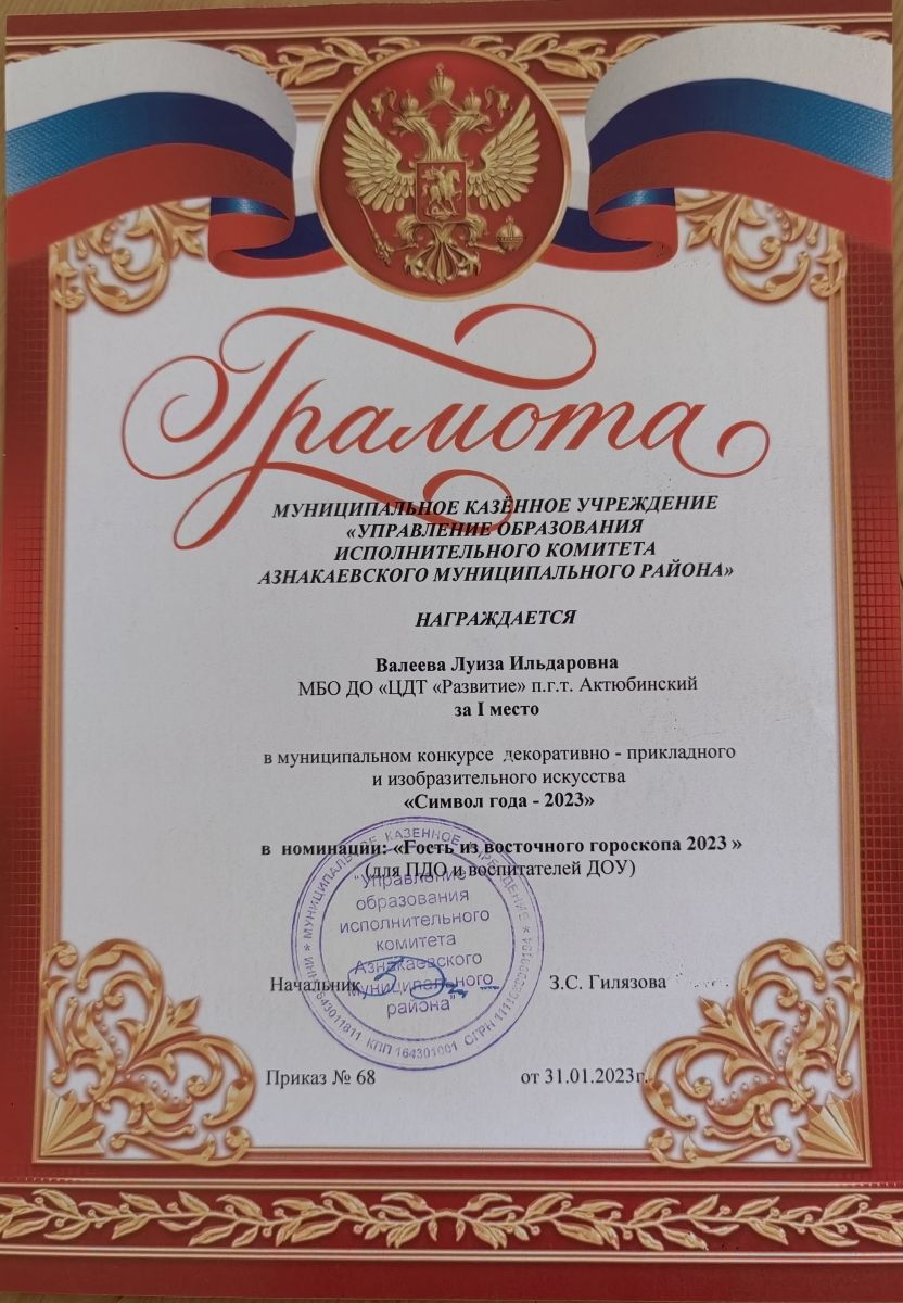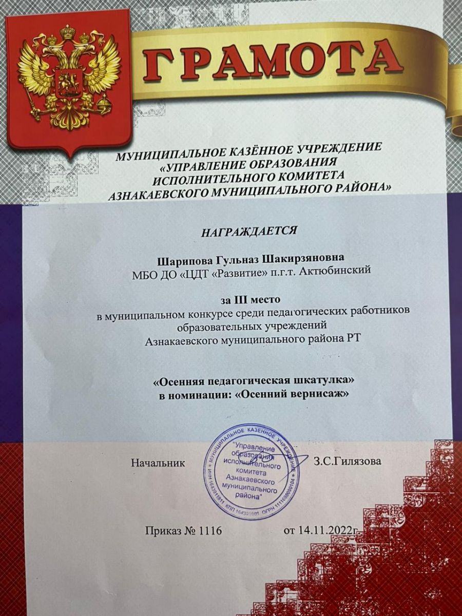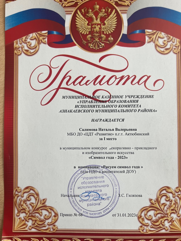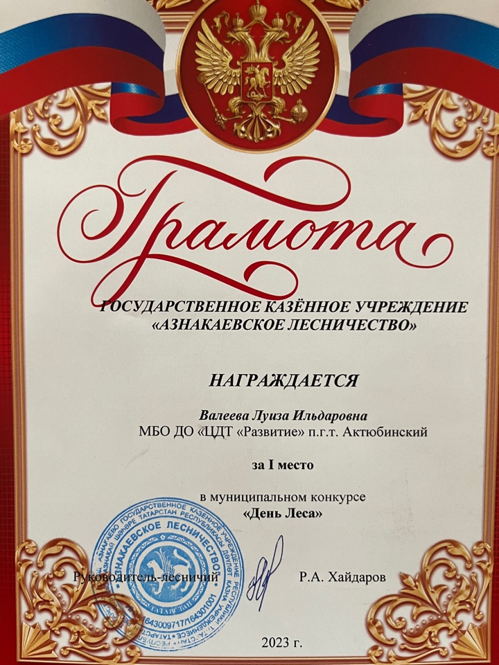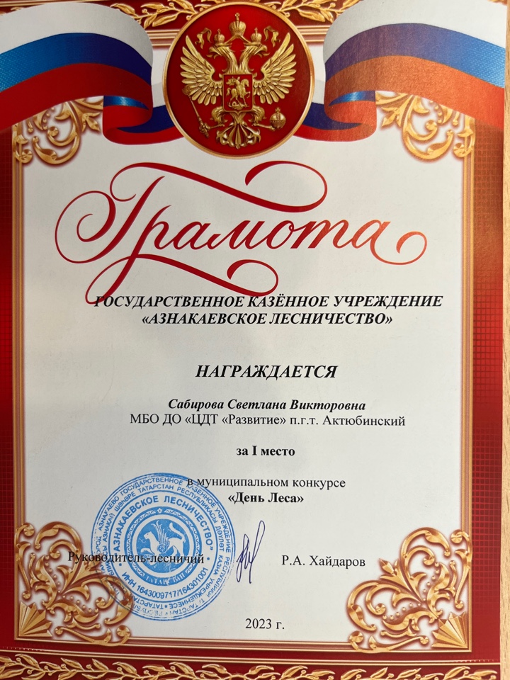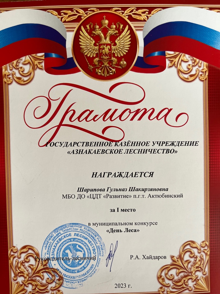 Грамота за 1 место в муниципальном конкурсе "День леса", педагог Шарипова Г.Ш.