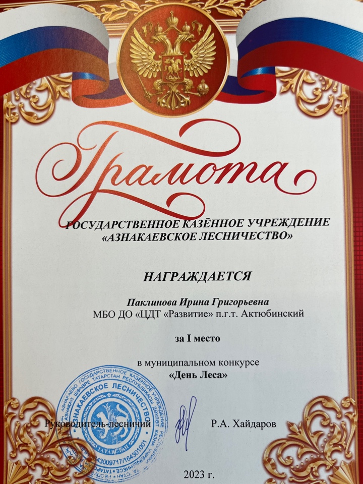 Грамота за 1 место в муниципальном конкурсе "День леса", педагог Паклинова И.Г.