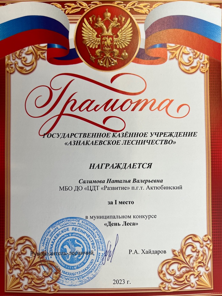 Грамота за 1 место в муниципальном конкурсе "День леса", педагог Салимова Н.В.