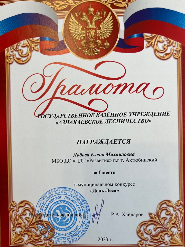 Грамота за 1 место в муниципальном конкурсе "День леса", педагог Лобова Е.М.