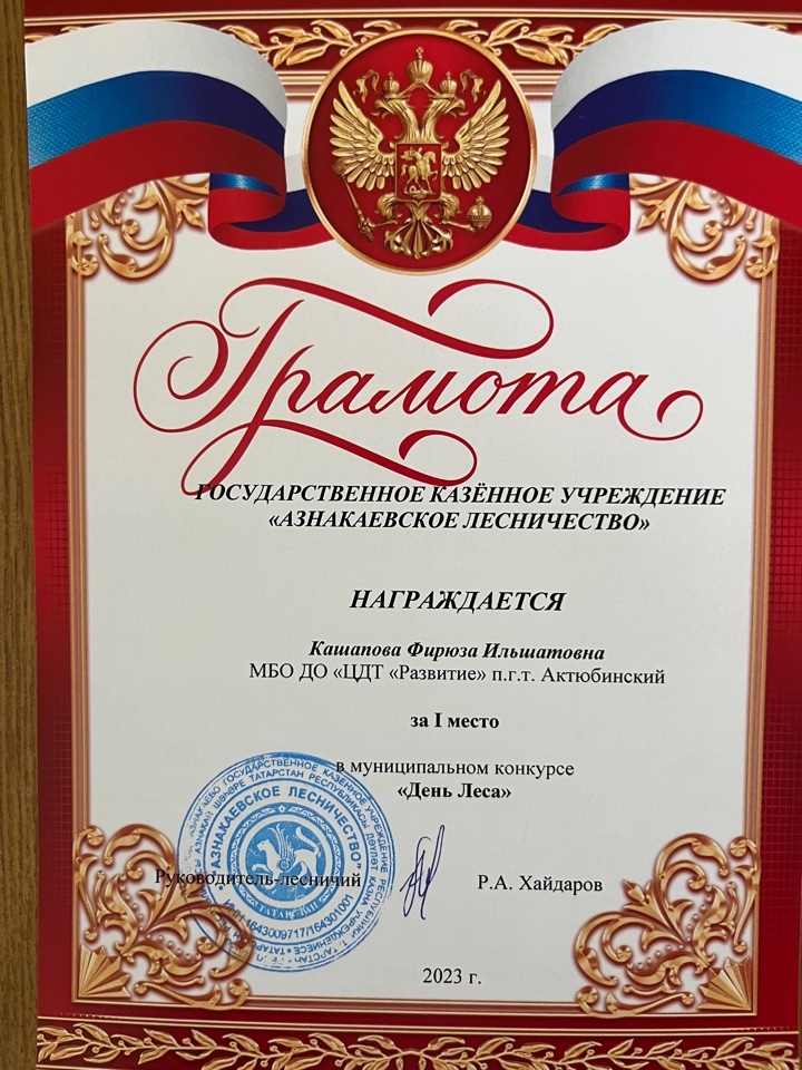 Грамота за 1 место в муниципальном конкурсе "День леса", педагог Кашапова Ф.И.