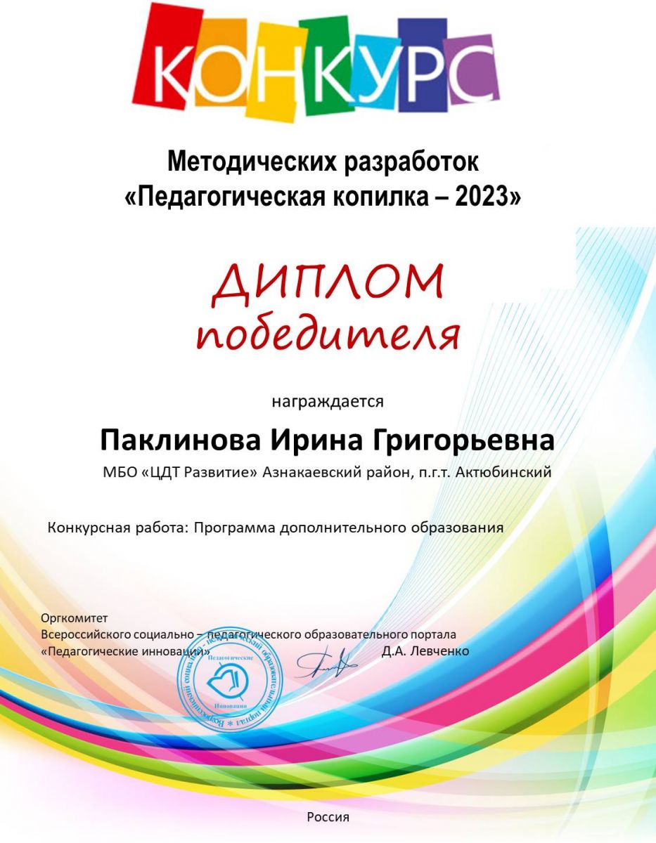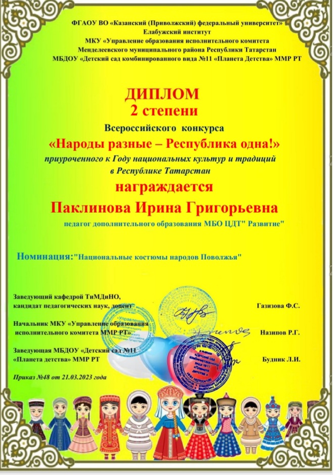 Диплом 2 степени Всероссийского конкурса "Народы разные - Республика одна!", педагог Паклинова И.Г.