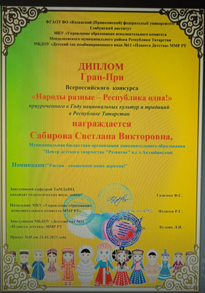 Диплом ГРАН - ПРИ Всероссийского конкурса "Народы разные - Республика одна!", педагог Сабирова С.В
