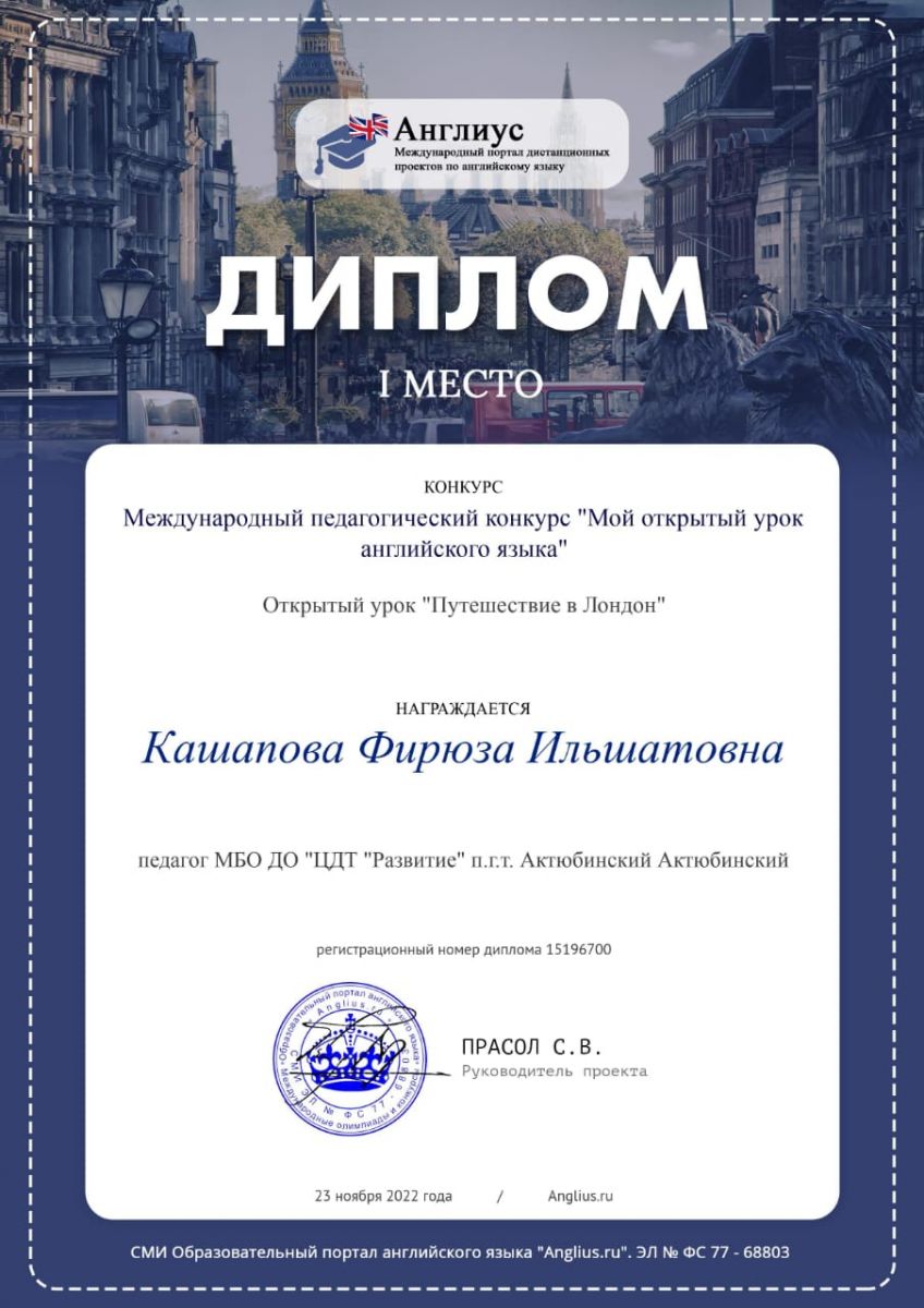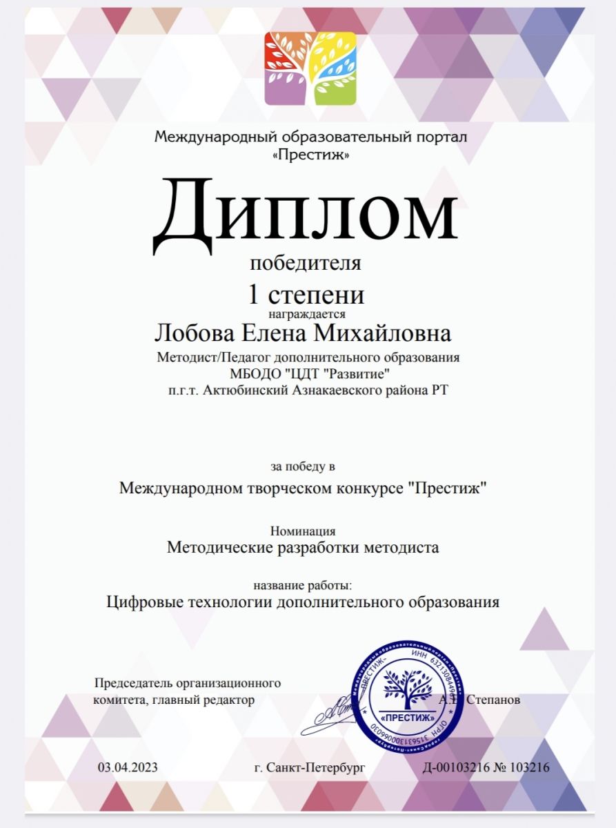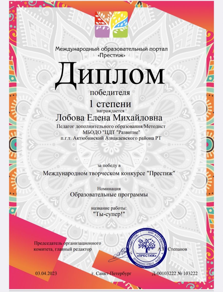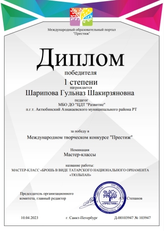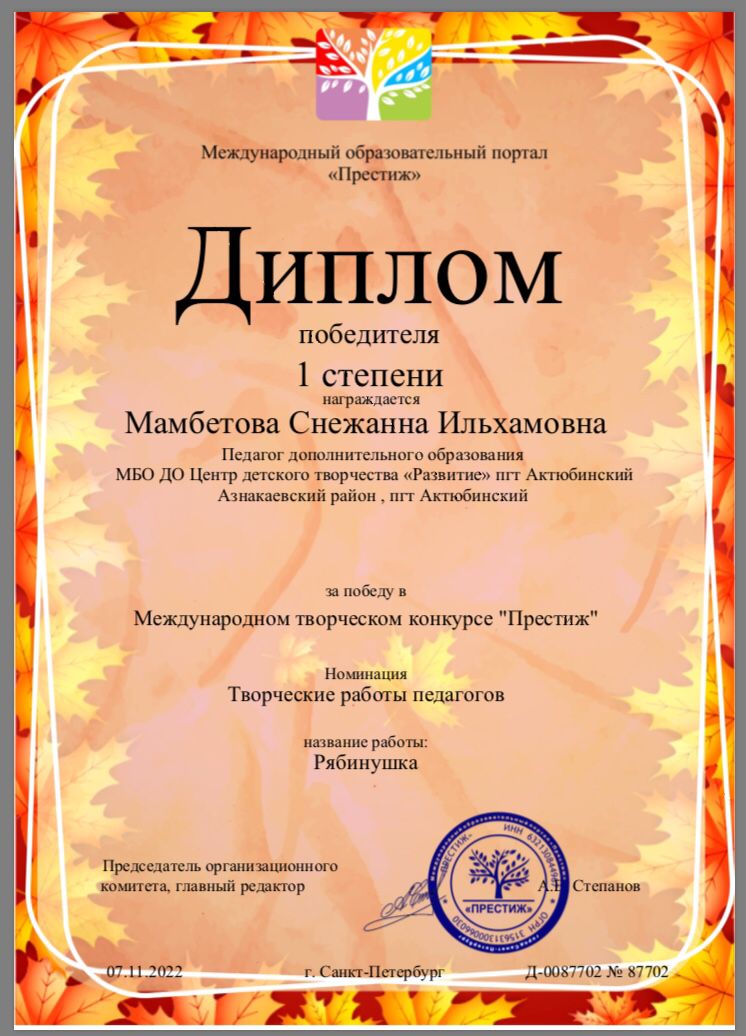 Диплом 1 степени за победу в Международном творческом конкурсе "Престиж", педагог Мамбетова С.И.