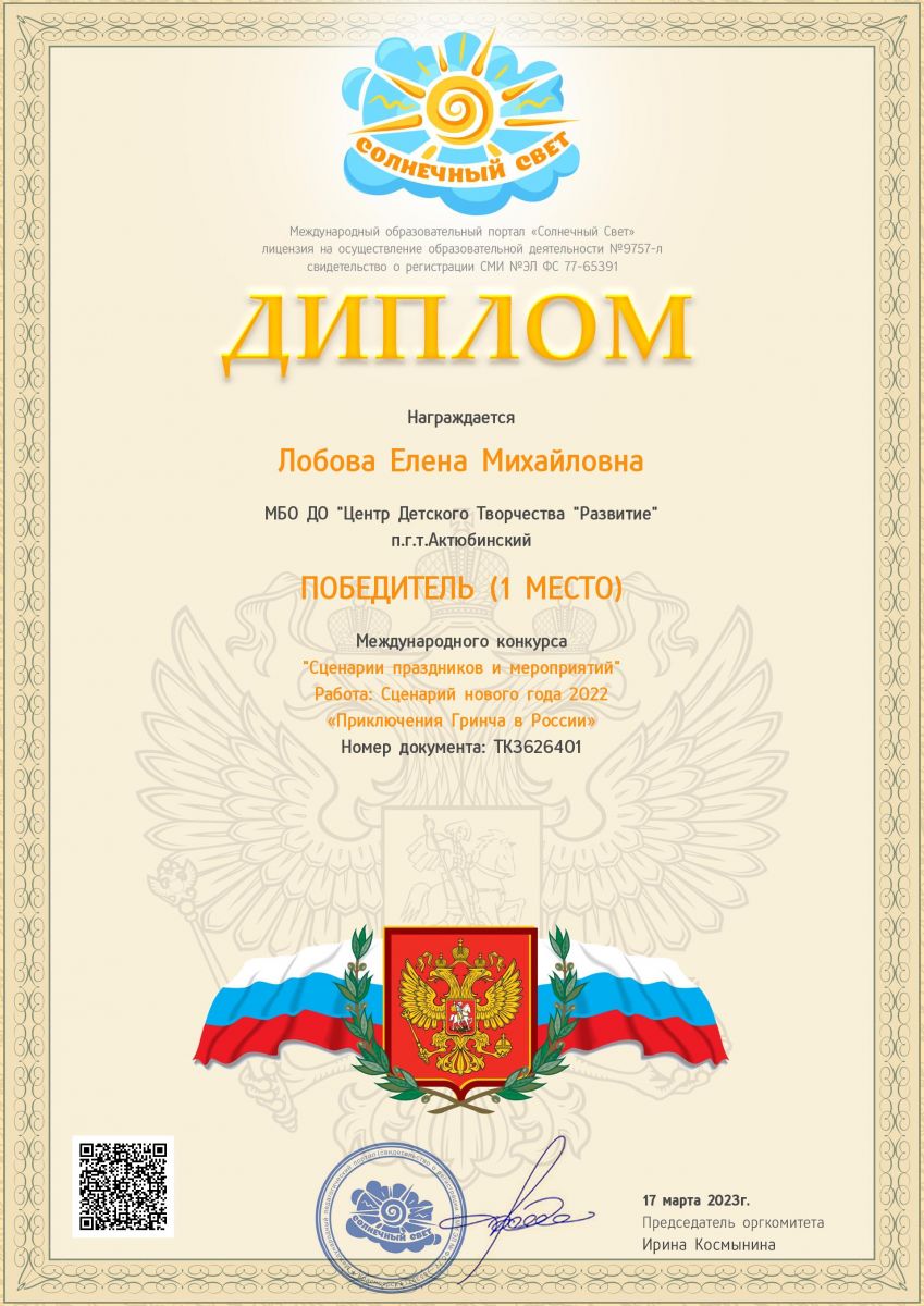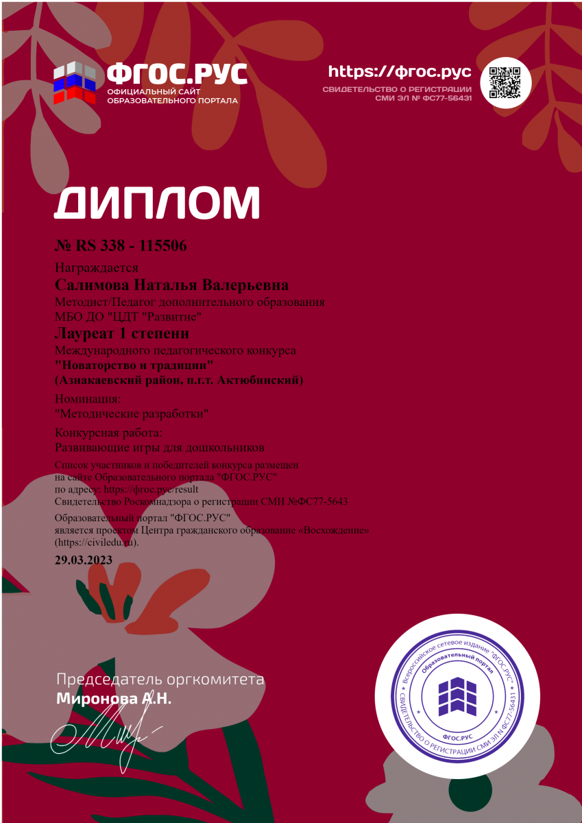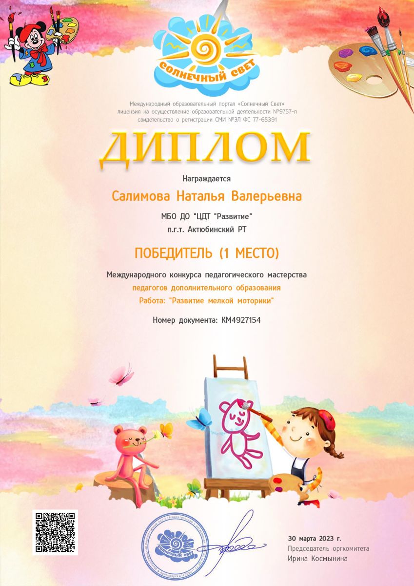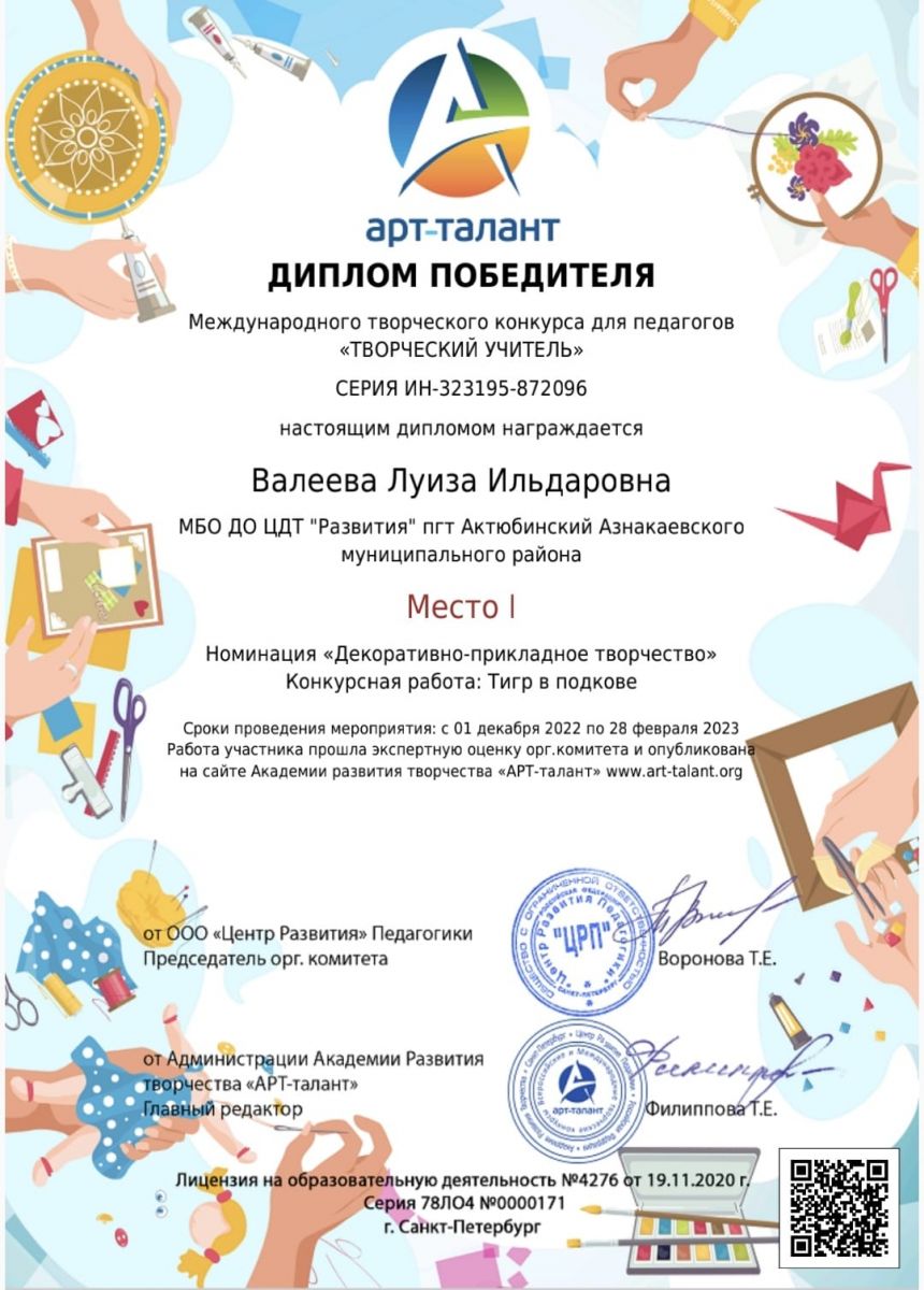 Диплом 1 степени за победу в Международном творческом конкурсе "Престиж", педагог Мамбетова С.И.