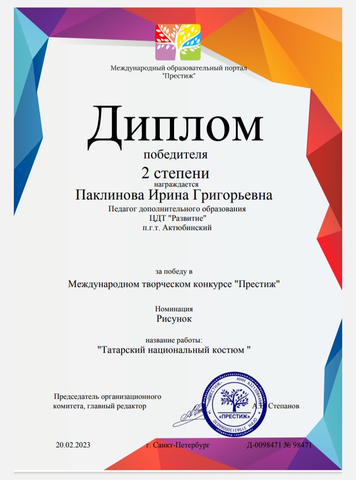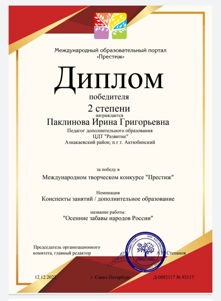 Диплом победителя 2 степени Международного творческого конкурса "Престиж", педагог Паклинова И.Г.