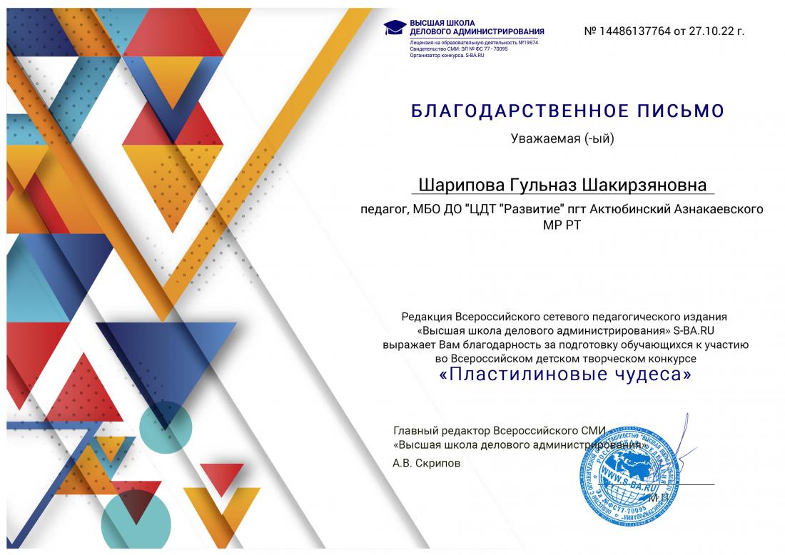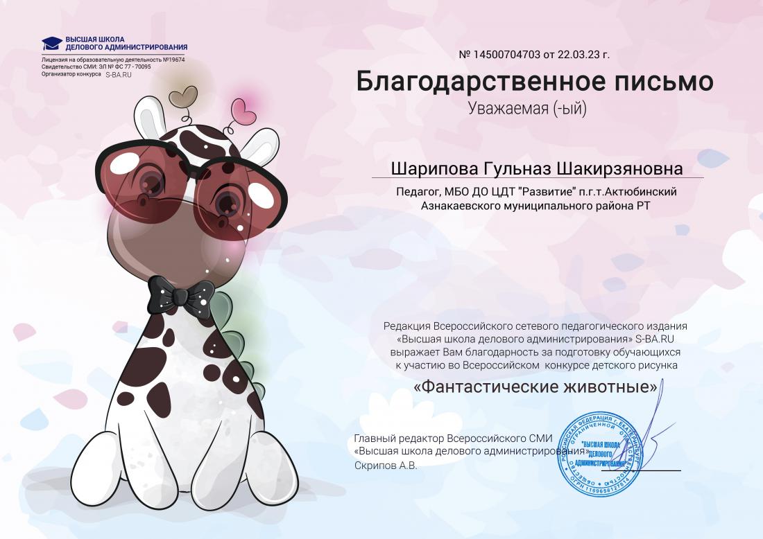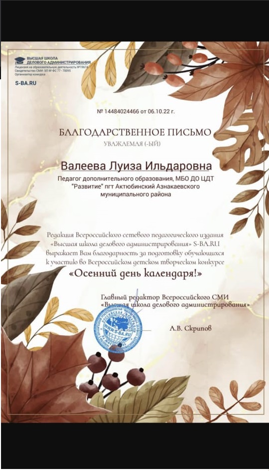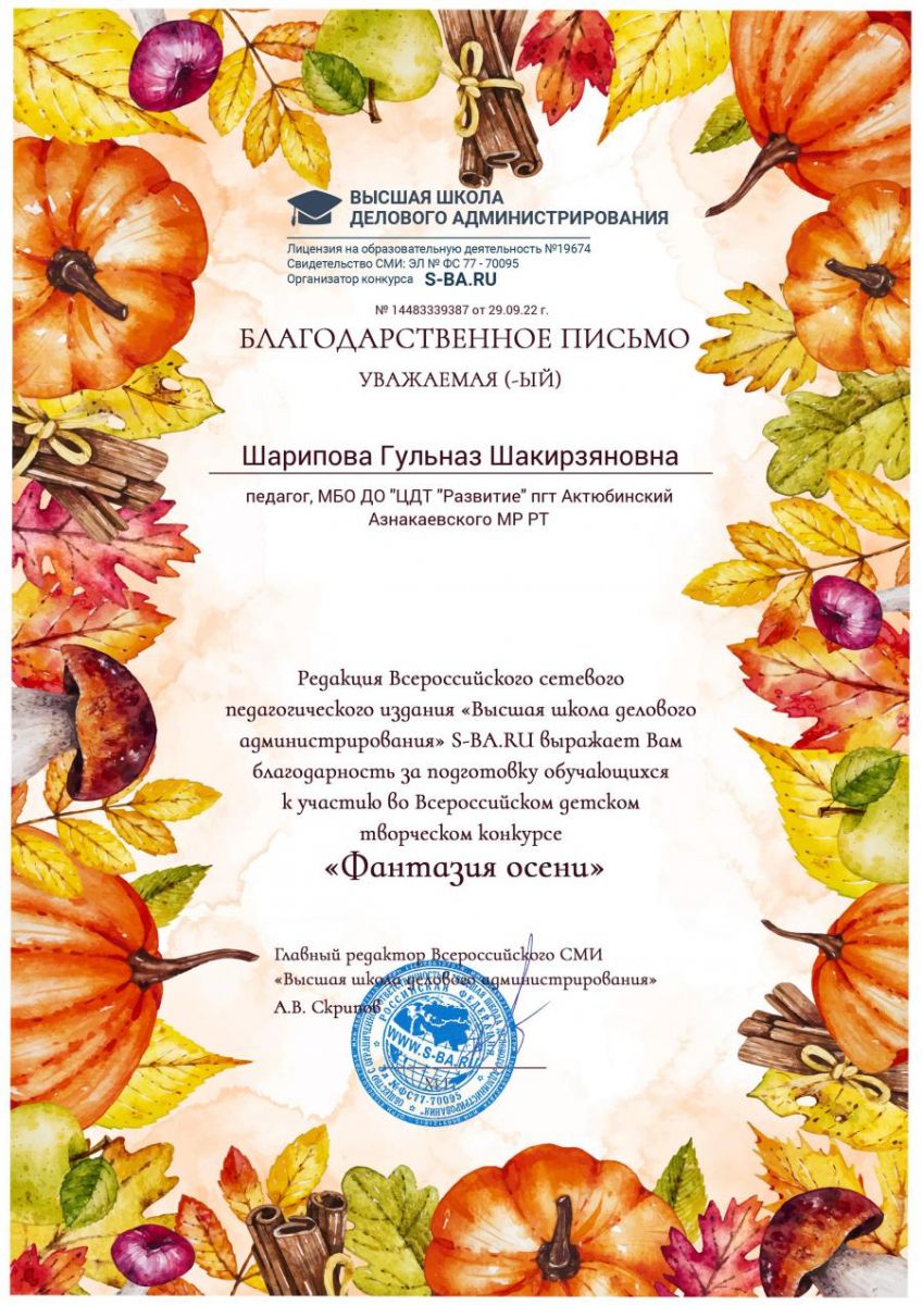 Благодарственное письмо за подготовку обучающихся в конкурсе "Фантазия осени", педагог Шарипова Г.Ш.