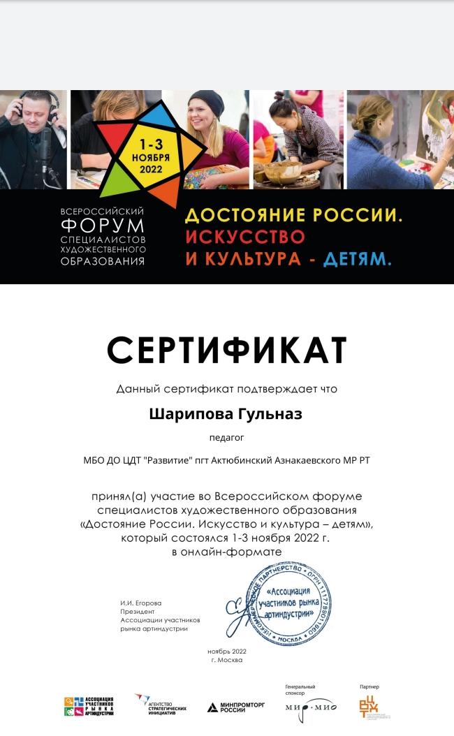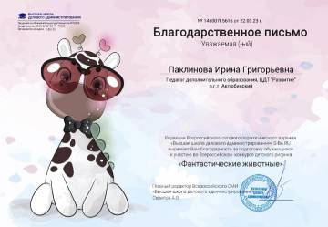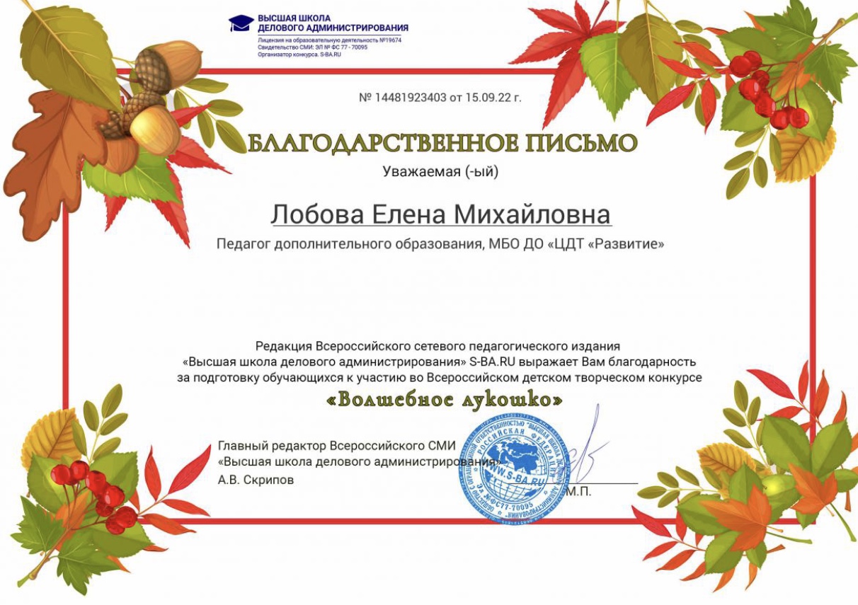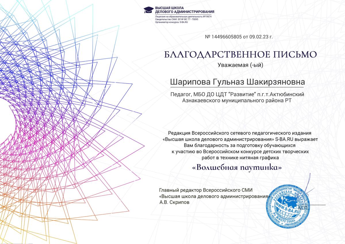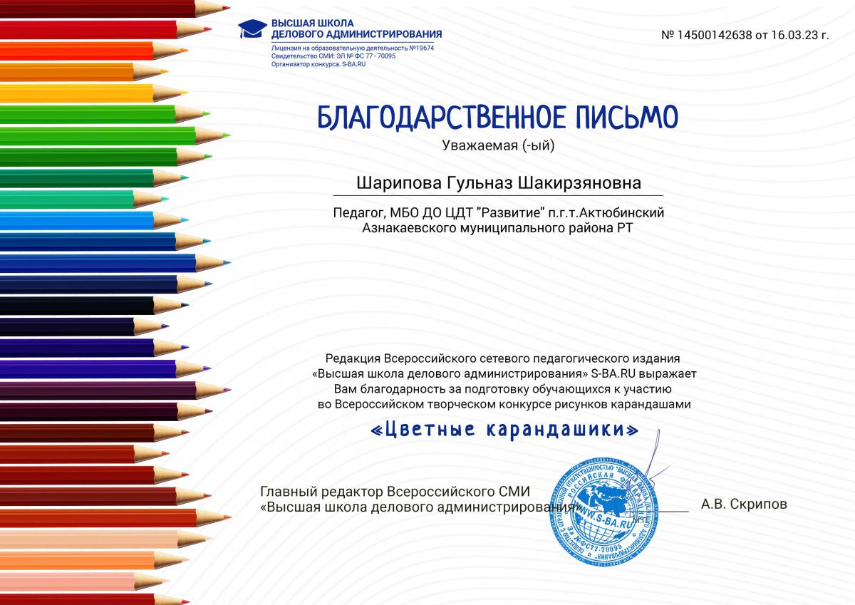 Благодарственное письмо за подготовку обучающихся в конкурсе "Фантазия осени", педагог Шарипова Г.Ш.