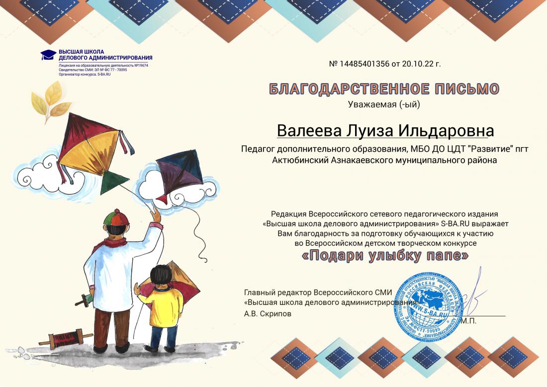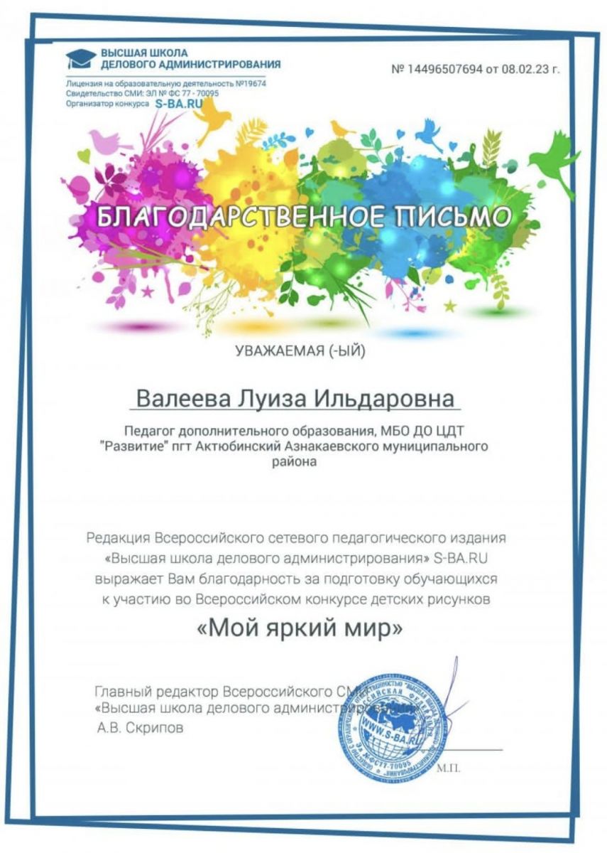 Благодарственное письмо за подготовку обучающихся в конкурсе "Мой яркий мир", педагог Валеева Л.И.