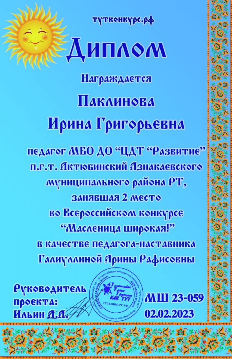 Диплом педагога-наставника в конкурсе "Масленница широкая", педагог Паклинова И.Г.