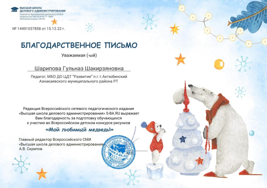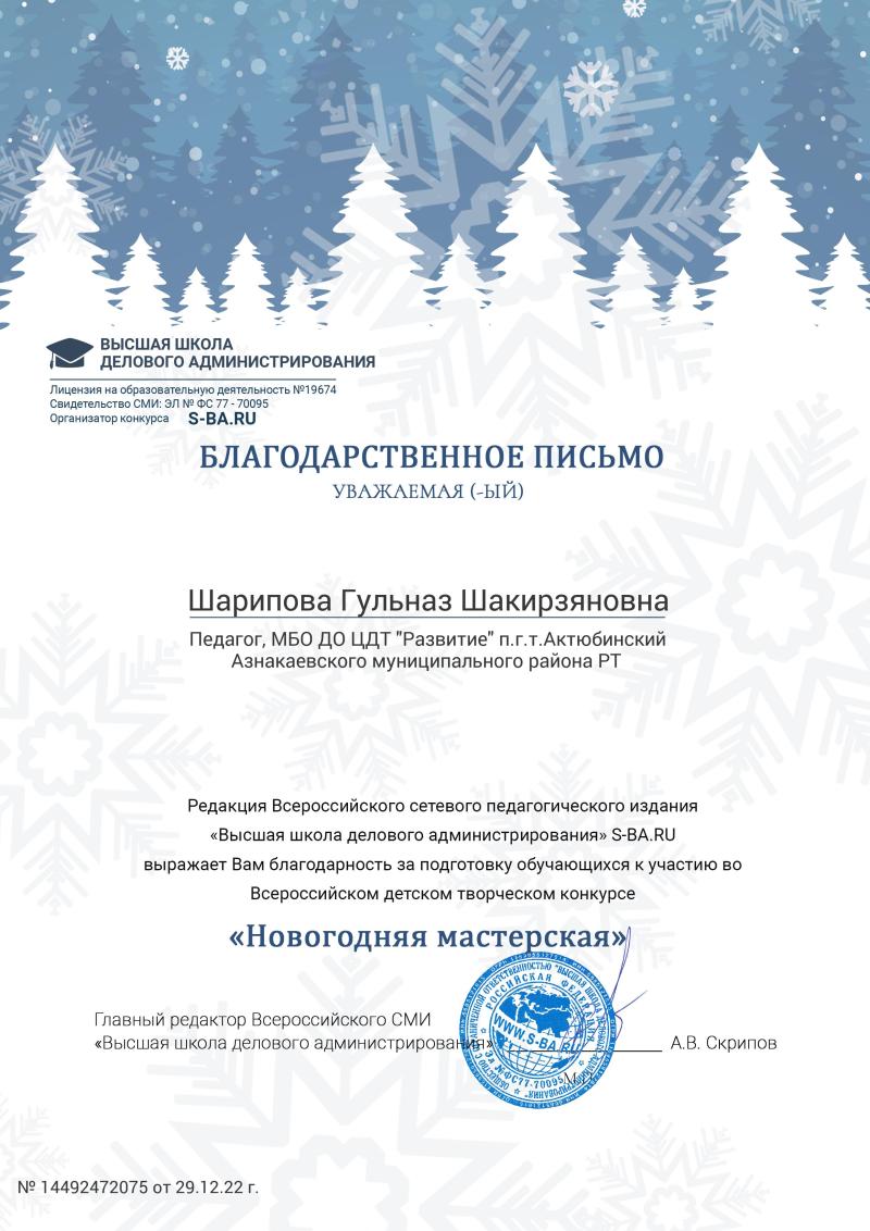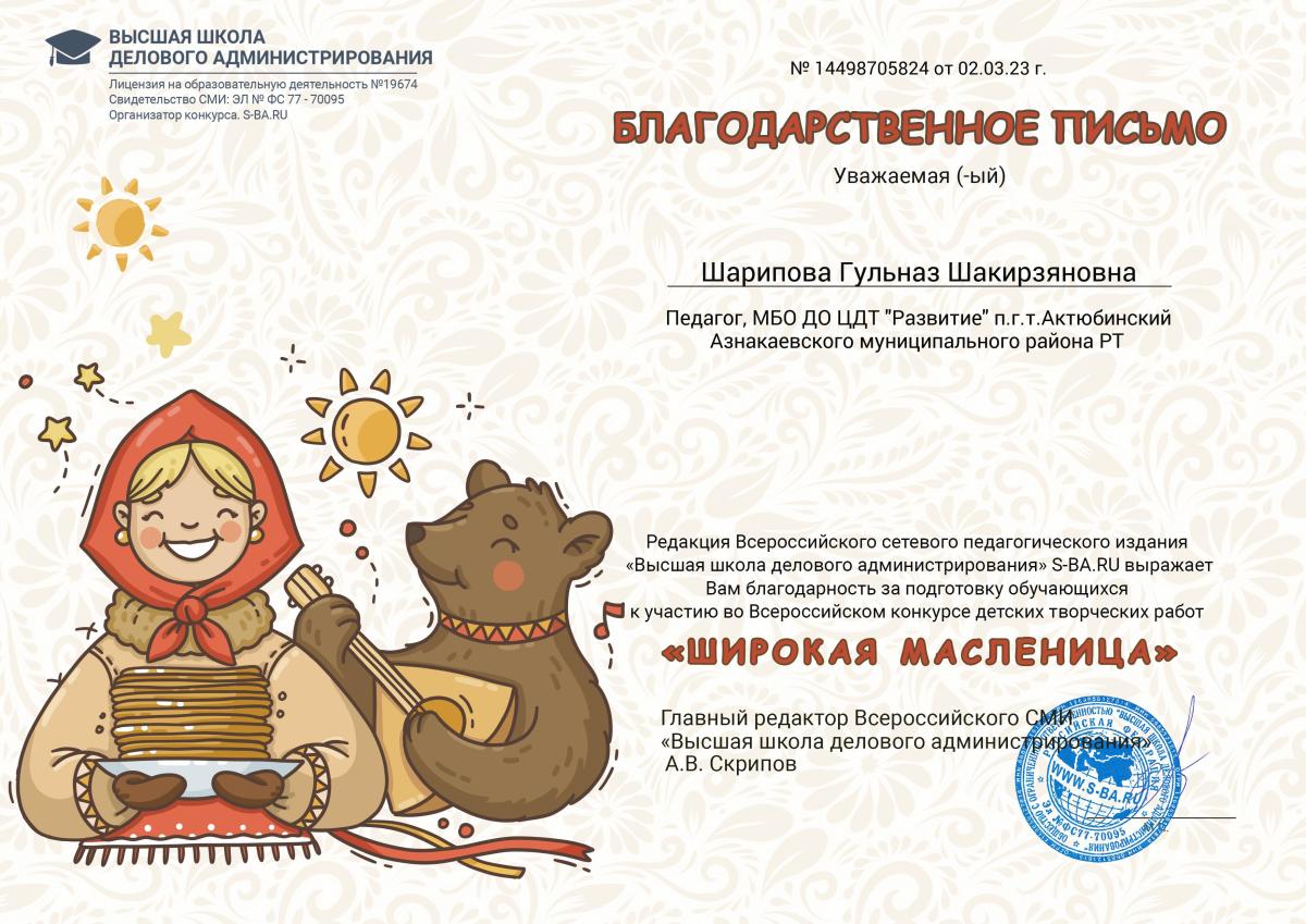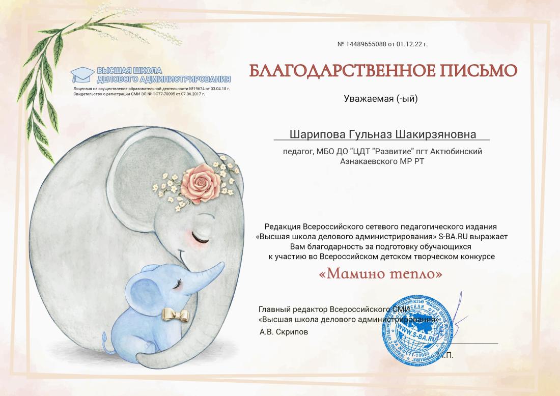 Благодарственное письмо за подготовку обучающихся в конкурсе "Мамино тепло", педагог Шарипова Г.Ш.