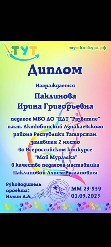 Диплом педагога-наставника в конкурсе "Мой мурлыка", педагог Паклинова И.Г.