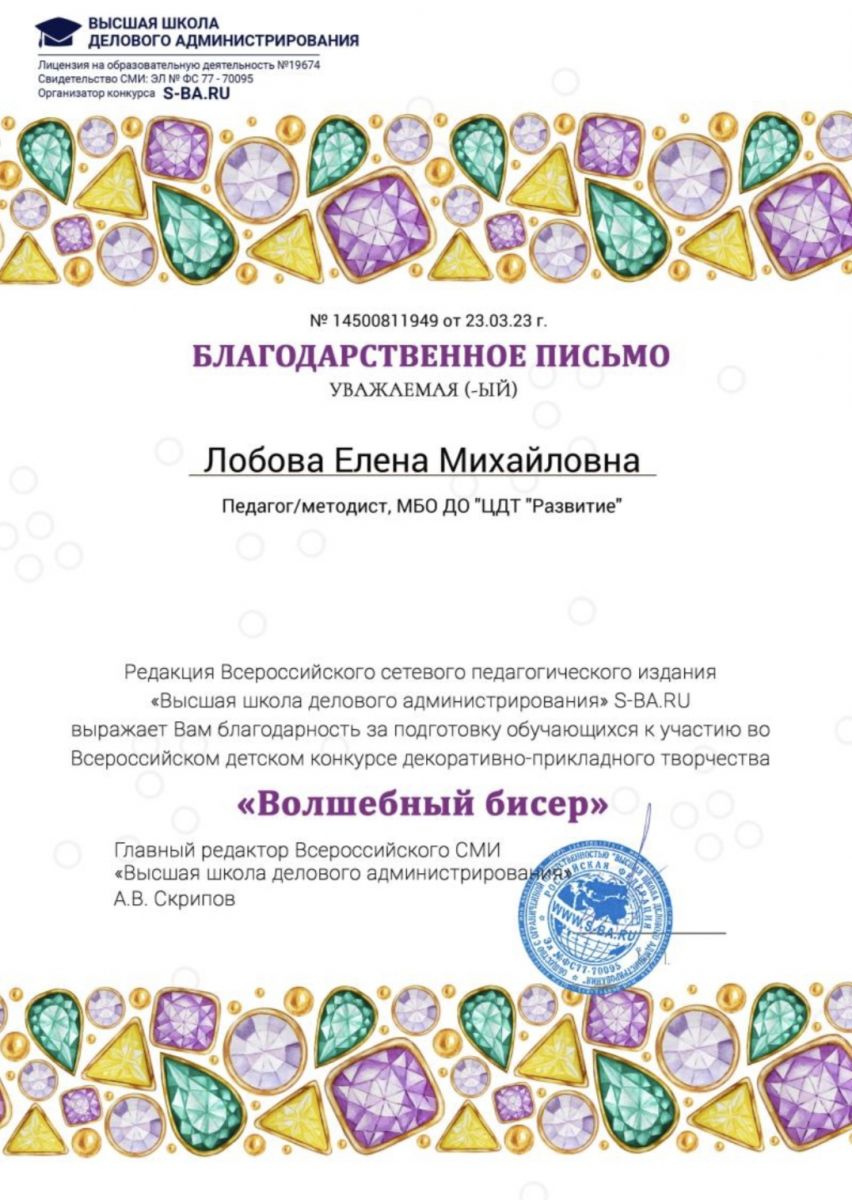 Благодарственное письмо за подготовку обучающихся к конкурсу "Время чудес", педагог Мамбетова С.И.