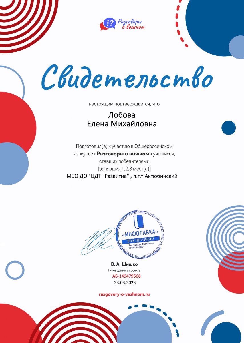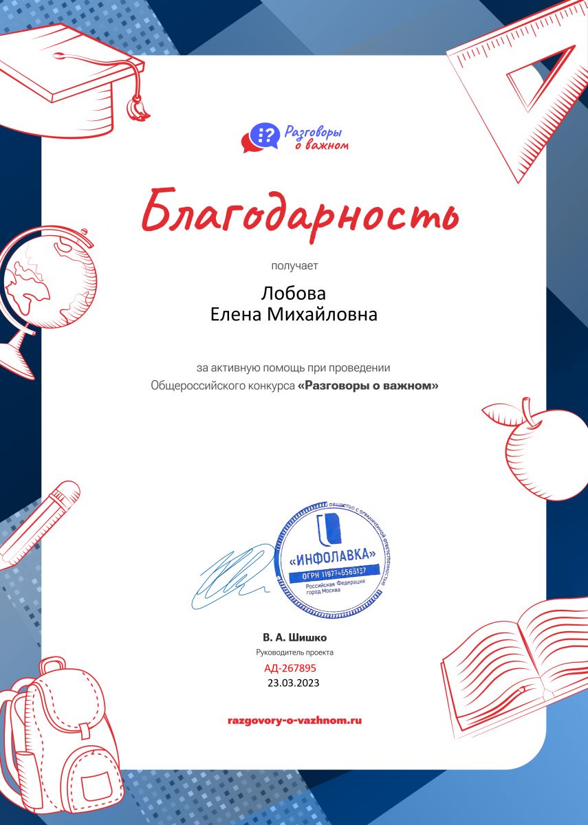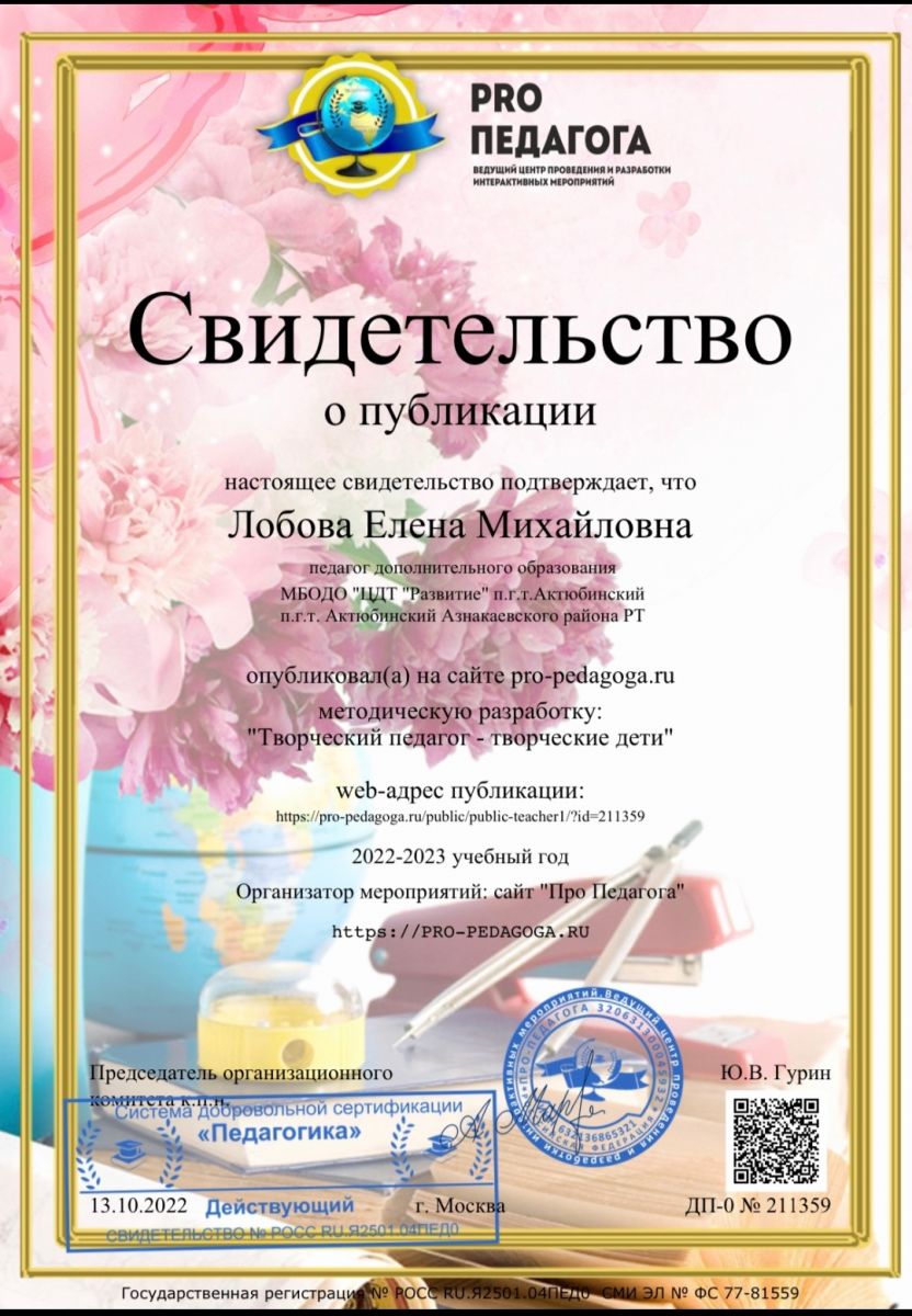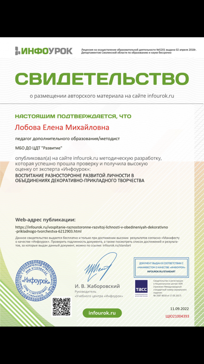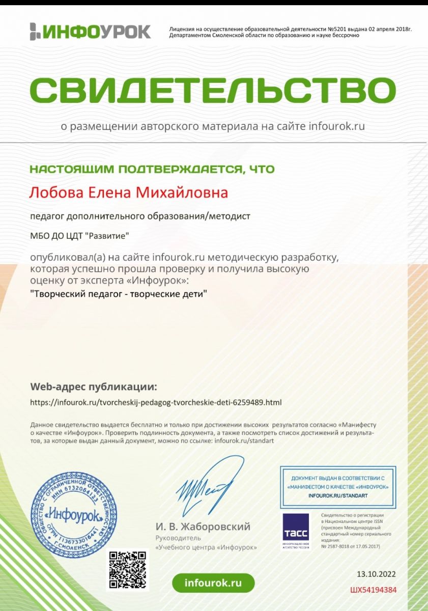 Свидетельство о размещении авторского материала на сайте infourok.ru, педагог Лобова Е.М.