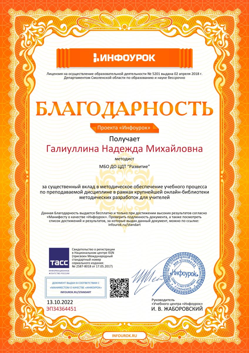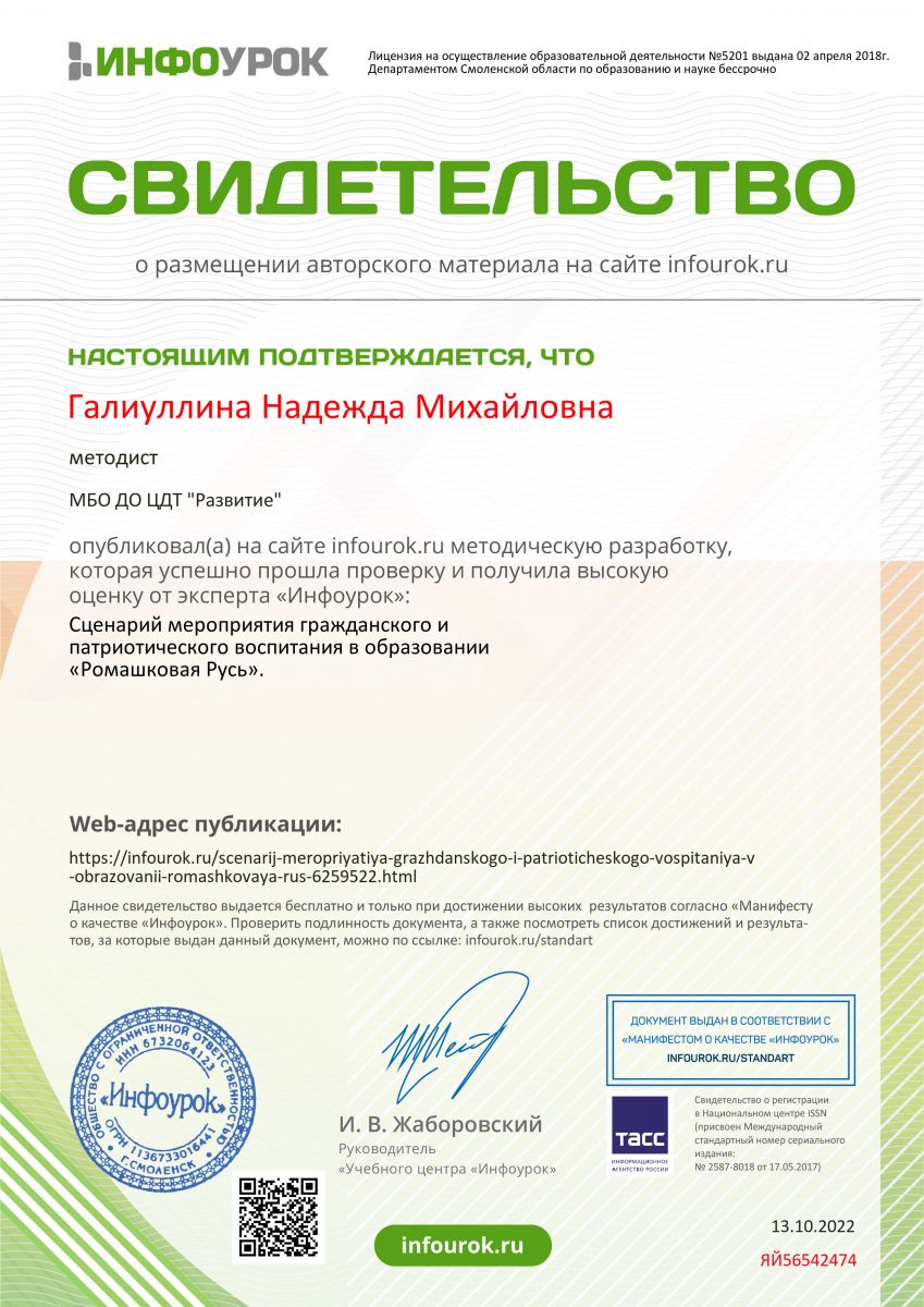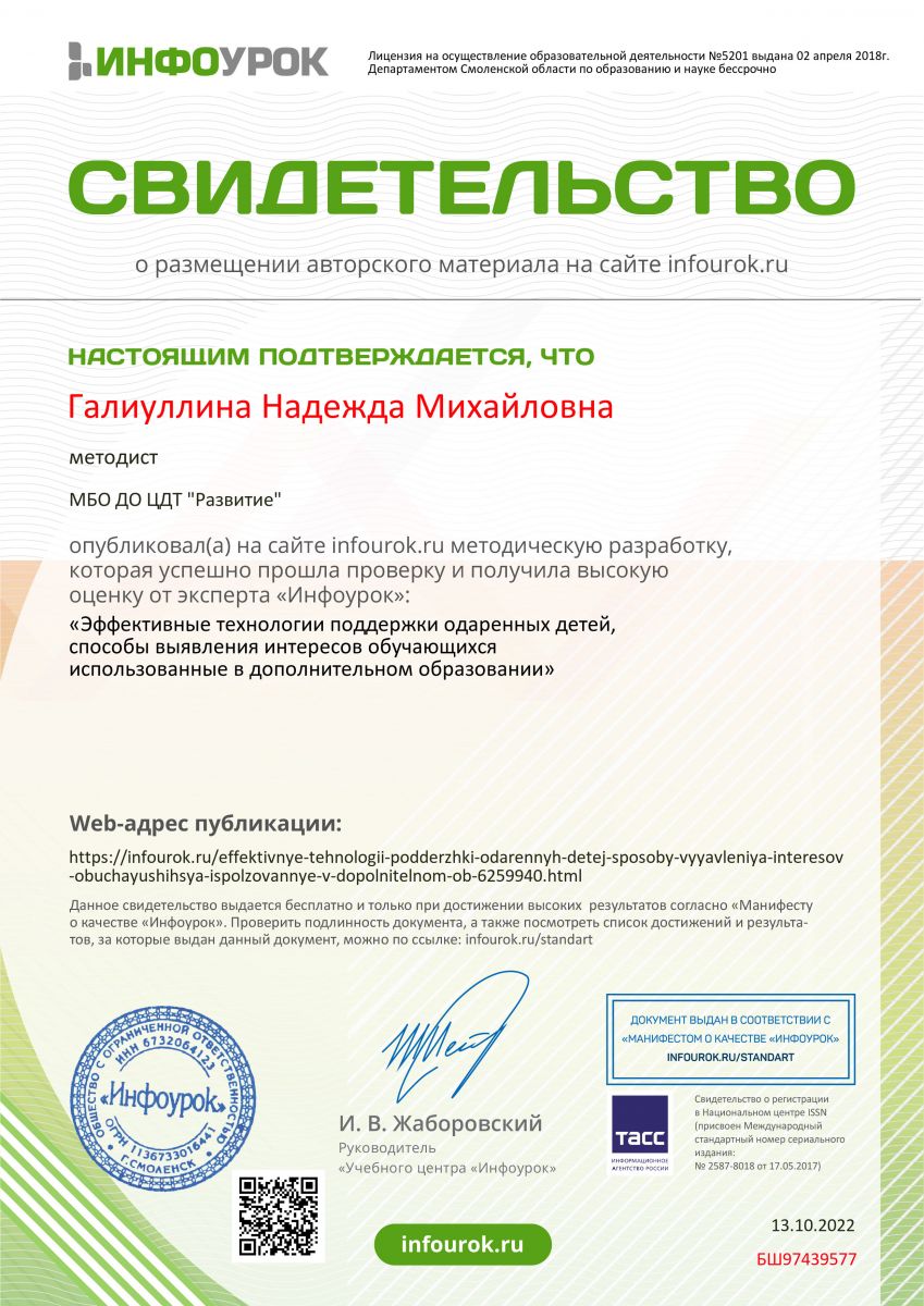 Свидетельство о размещении авторского материала на сайте infourok.ru, педагог Галиуллина Н.М.